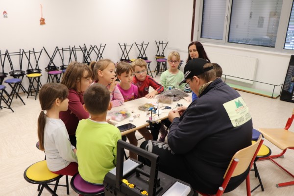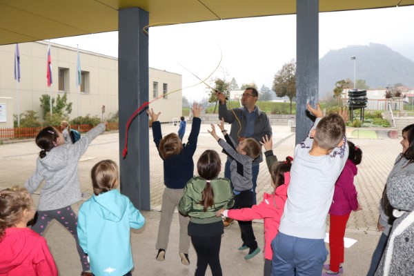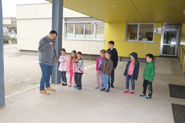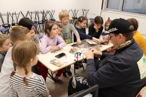 Delavnico muharjenja je vodil g. Gašper Jesenšek. Učenci so se praktično preizkusili v muharjenju. Uporabili so “practicasterje, ki so imitacija pravih ribiških palic, namenjenih treningu otrok.