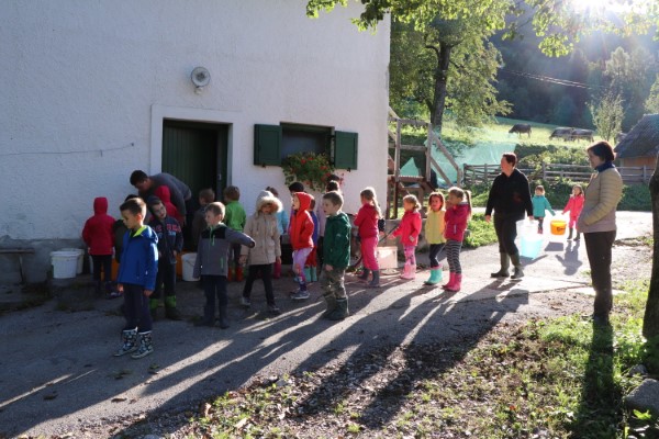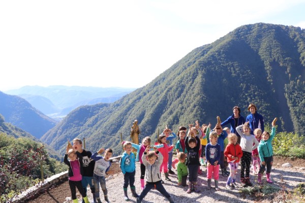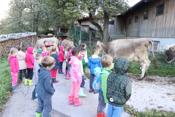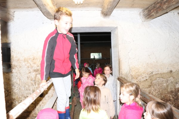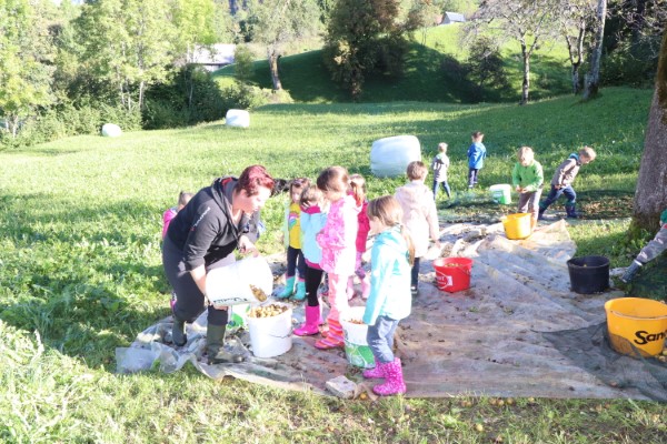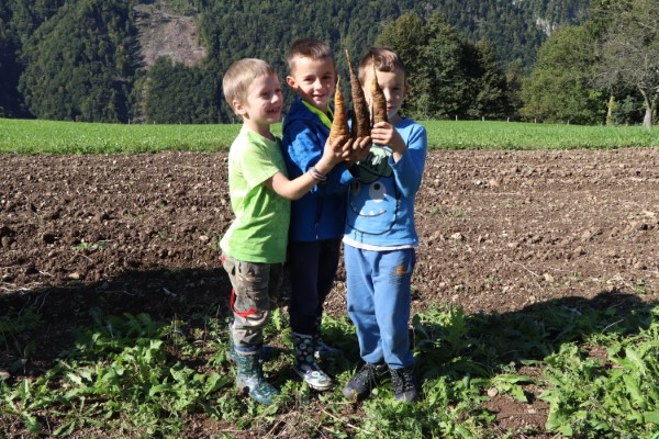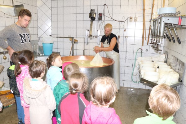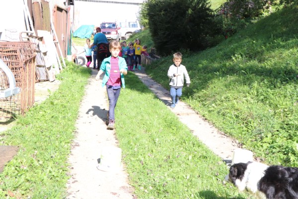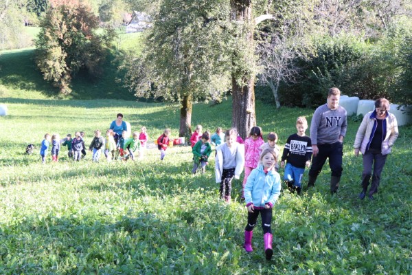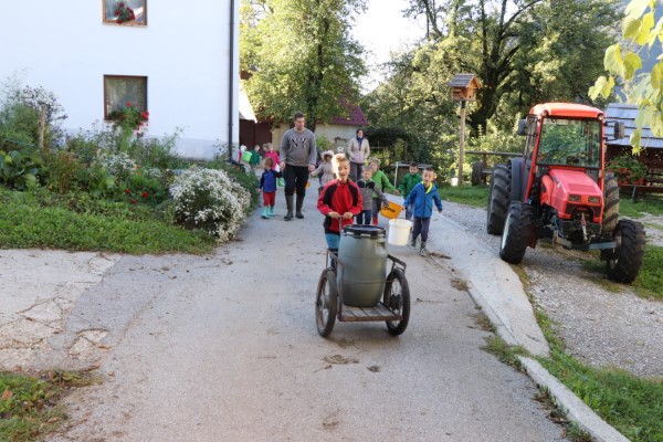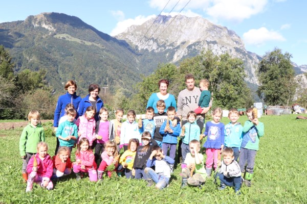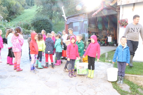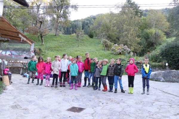 Za en dan smo učilnico v Tolminu zamenjali z učilnico v Čadrgu. Toplo so nas sprejeli na kmetiji pr` Kumru. Gnali smo krave na pašo, si ogledali mlekarnico in kako izdelujejo sir, nabirali orehe in hruške, največji izziv pa nam je predstavljalo polje korenja. En, dva, tri … in že smo ga populili. Sprehodili smo se do razgledne točke, kjer smo v prijetnem jesenskem soncu tudi zapeli. Dan smo zaključili s štafetnimi igrami v nošnji krompirja.