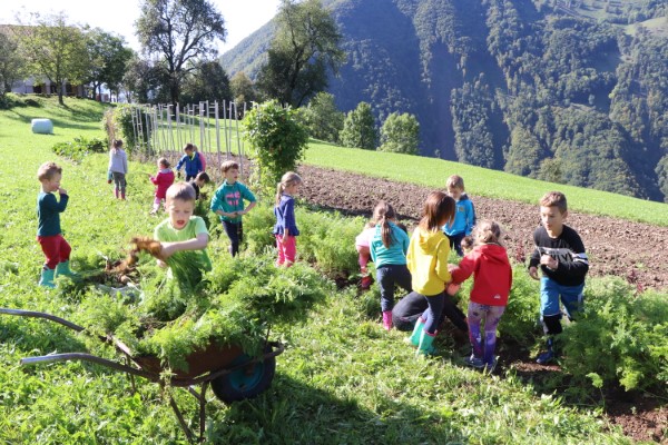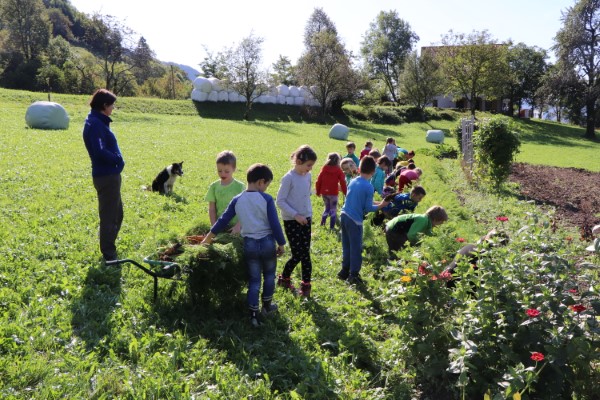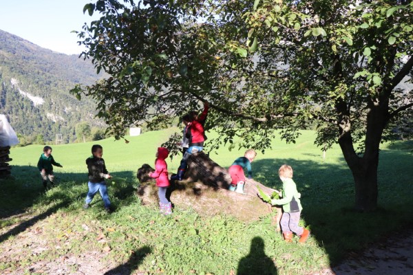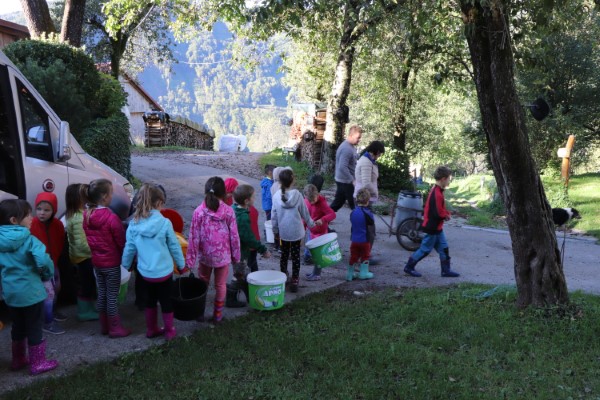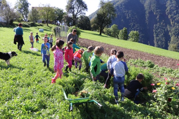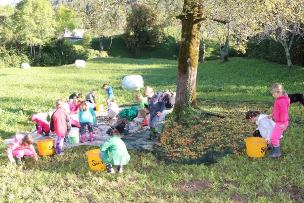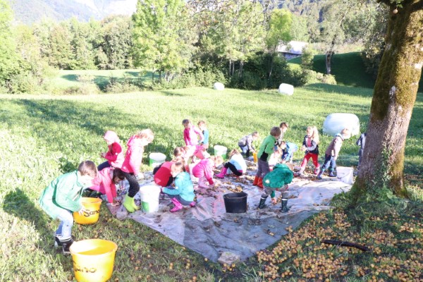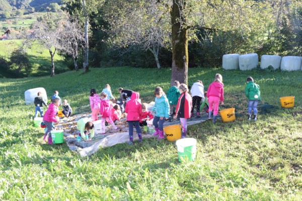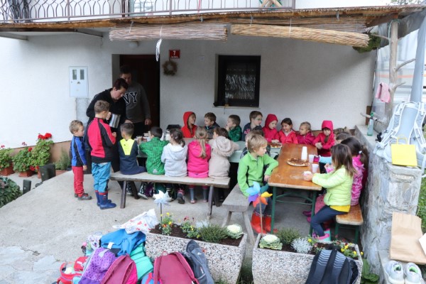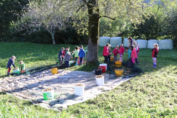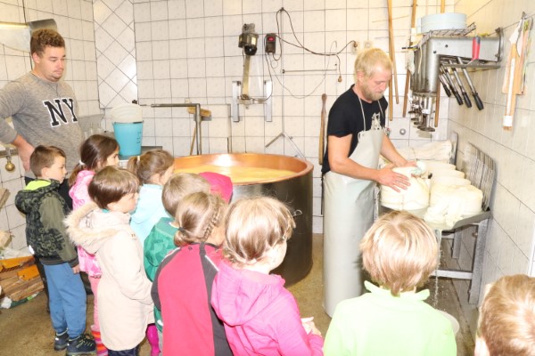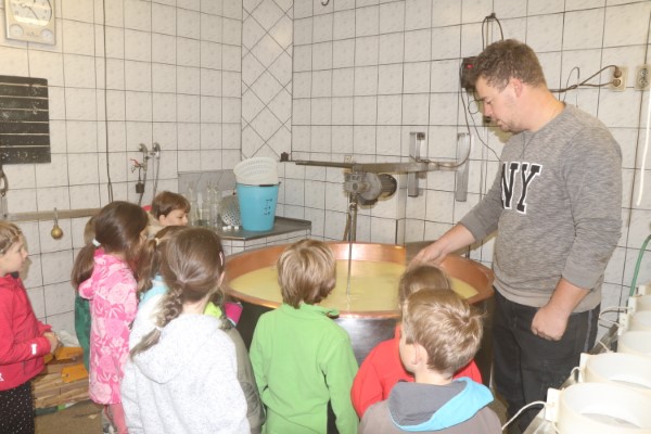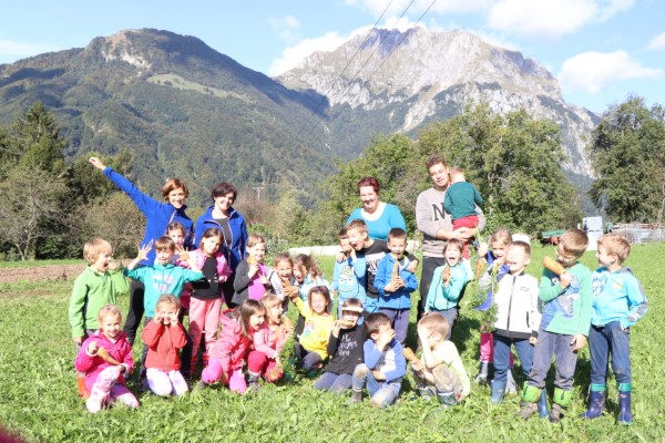 Za en dan smo učilnico v Tolminu zamenjali z učilnico v Čadrgu. Toplo so nas sprejeli na kmetiji pr` Kumru. Gnali smo krave na pašo, si ogledali mlekarnico in kako izdelujejo sir, nabirali orehe in hruške, največji izziv pa nam je predstavljalo polje korenja. En, dva, tri … in že smo ga populili. Sprehodili smo se do razgledne točke, kjer smo v prijetnem jesenskem soncu tudi zapeli. Dan smo zaključili s štafetnimi igrami v nošnji krompirja.