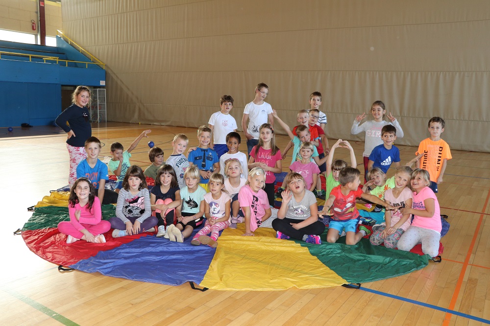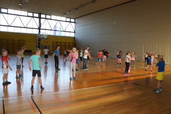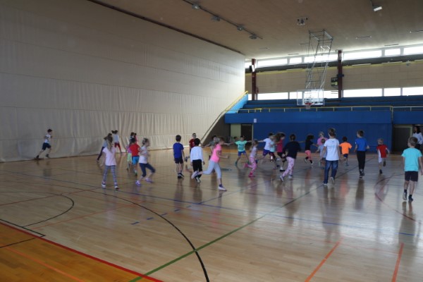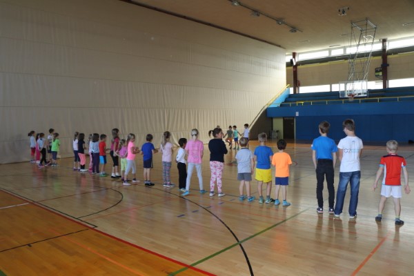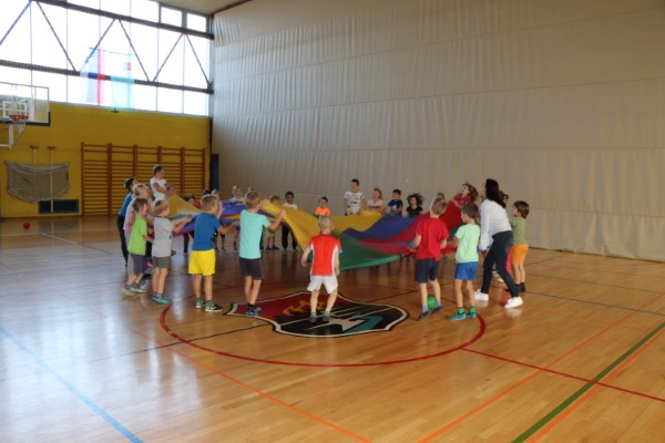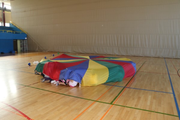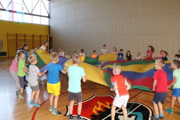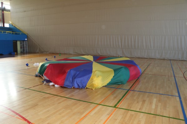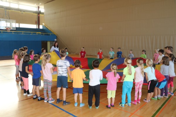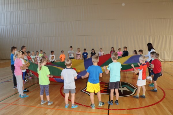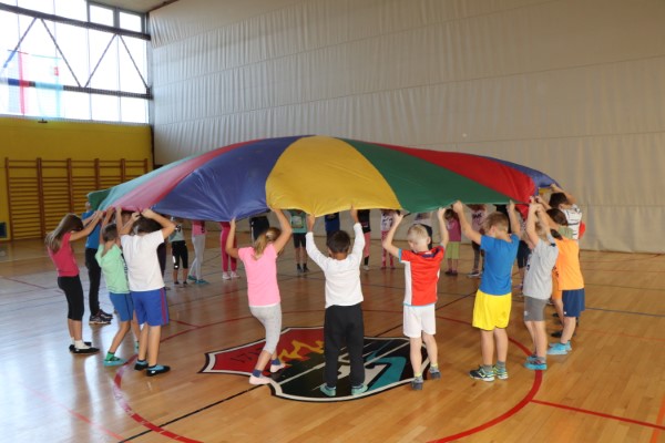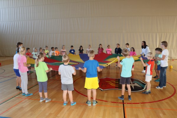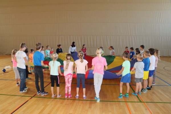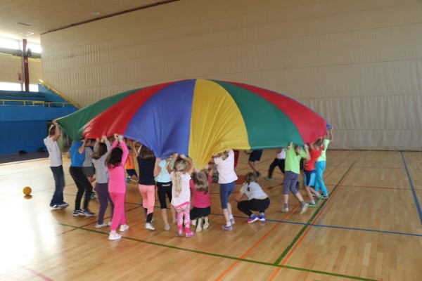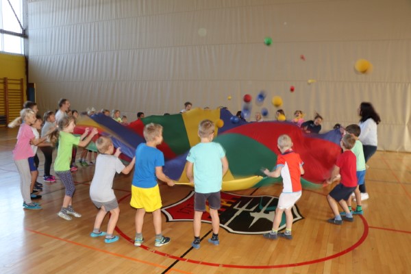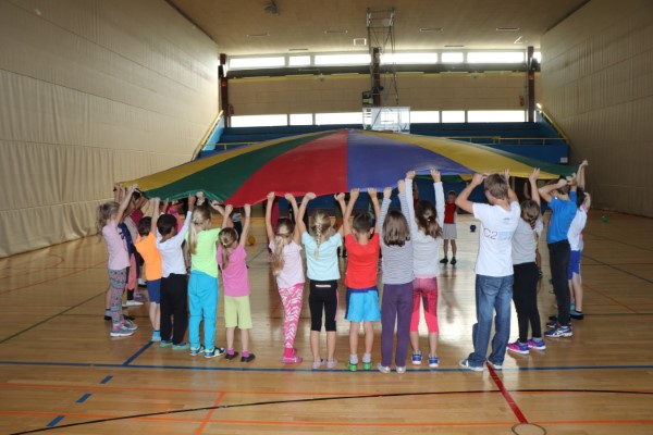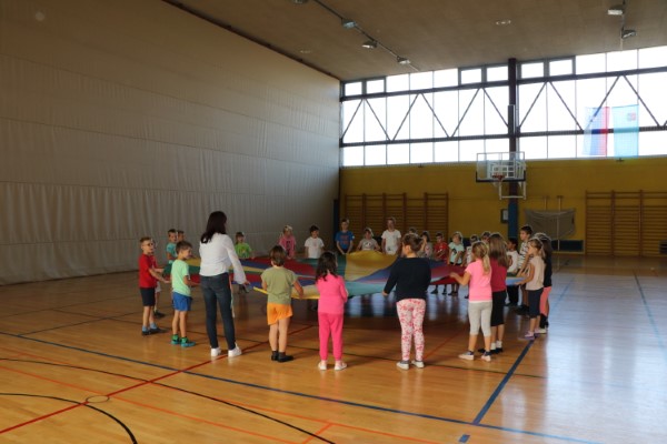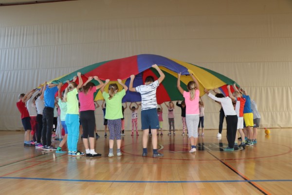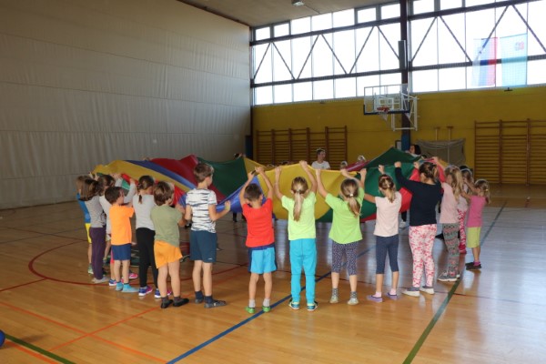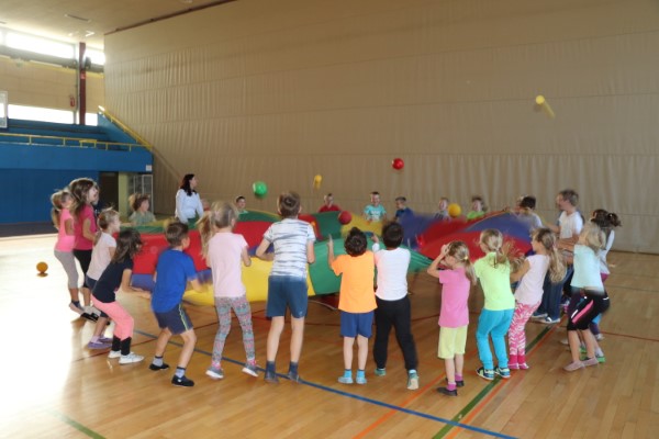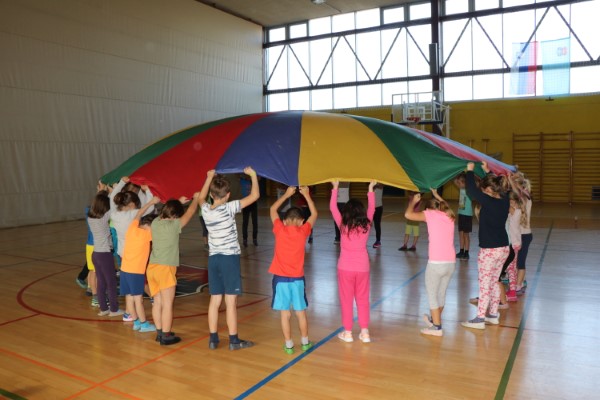 Prvič smo se družili z učenci drugega in četrtega razreda Podružnične šole s posebnimi potrebami ter učiteljico Matejo Ivančič Leban, se spoznavali ter se zabavali z igrami s padalom pri uri športne vzgoje. Bila je sproščena in zabavna ura.