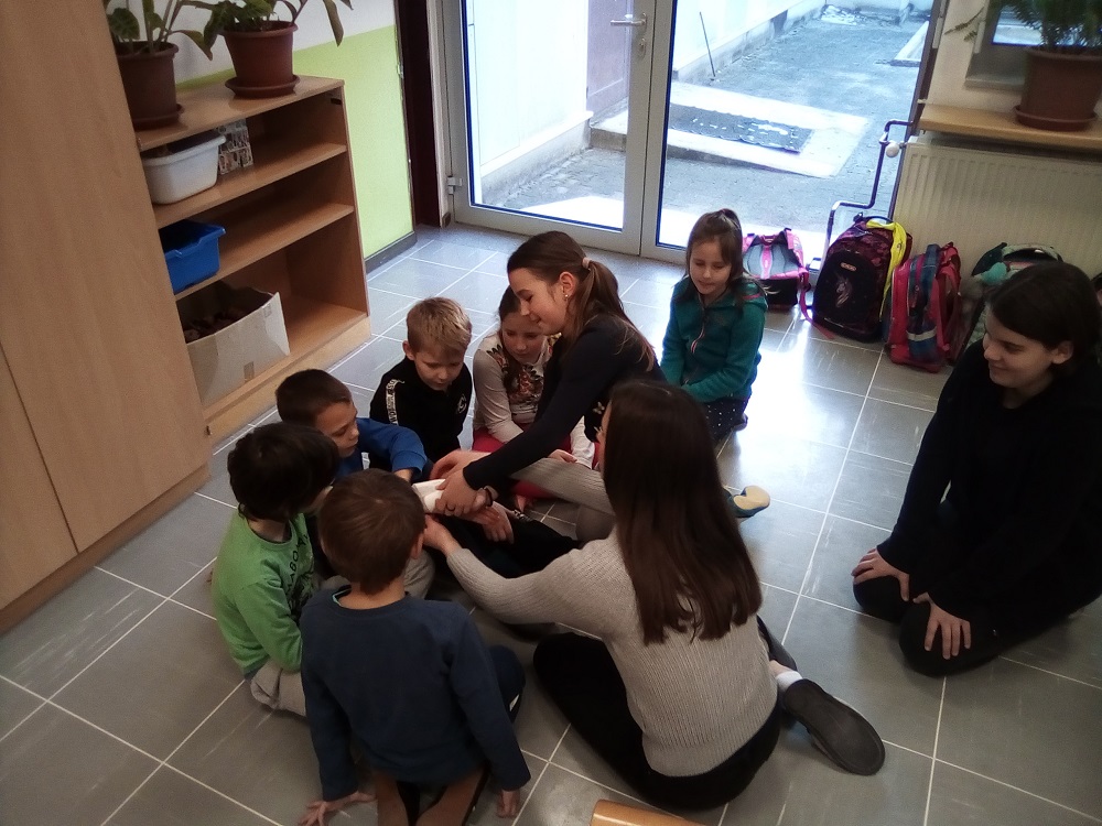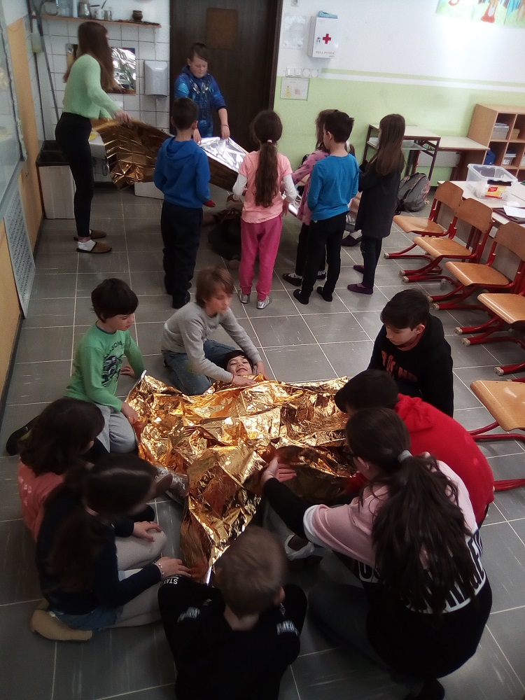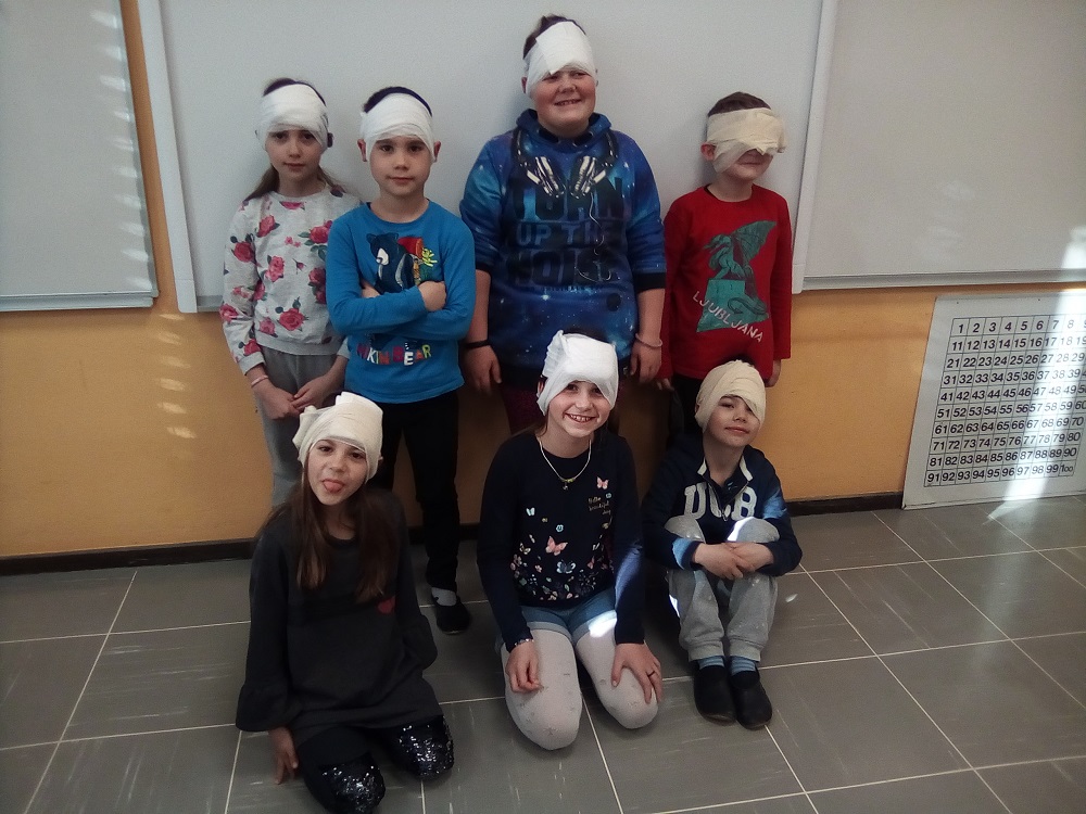 Prvič v tem šolskem letu smo v našem razredu gostili učenke in učence iz 8.razreda. Člani šolske ekipe prve pomoči imajo že veliko znanja pa tudi spretne prste. Pokazali so nam, kako oskrbimo poškodovanca, ki ima ranjeno glavo oz. poškodbo očesa, in nas naučili, kako s kompresijsko obvezo ustavimo arterijsko krvavitev. Skupaj smo ponovili in vadili položaj za nezavestnega. Potem smo se ojunačili tudi drugošolci. V roke smo vzeli prvi povoj, gaze in trikotno ruto. Pod budnim očesom starejših učencev smo oskrbovali zlome podlahti, nadlahti, ključnice, goleni in stegnjenice. In čeprav je prva pomoč resna stvar, smo se zelo zabavali. Šlo nam je zelo dobro in z redno vajo bomo lahko čez nekaj let nadomestili starejše učence.
