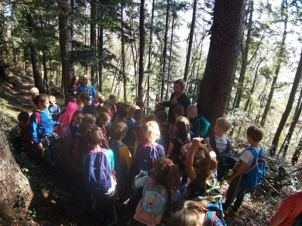 Po malici smo se v koloni odpravili proti vznožju Kozlovega roba. Na parkirišču nas je že čakal gozdar Florjan. Peljal nas je v gozd, kjer nam je povedal veliko zanimivega. Prav na vsako vprašanje, ki smo mu ga zastavili, je imel odgovor. Opozoril nas je, naj v gozdu ne kričimo, saj plašimo gozdne živali. Nekateri smo opazili dve srni, ki sta se premikali skozi podrast gozda.