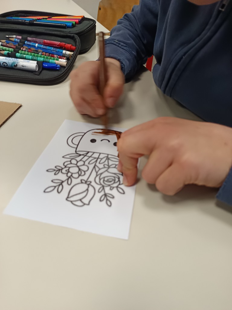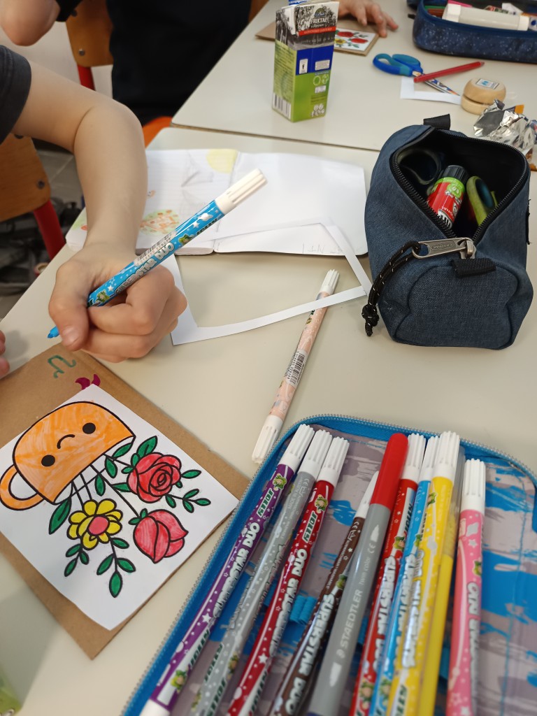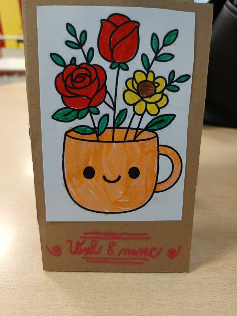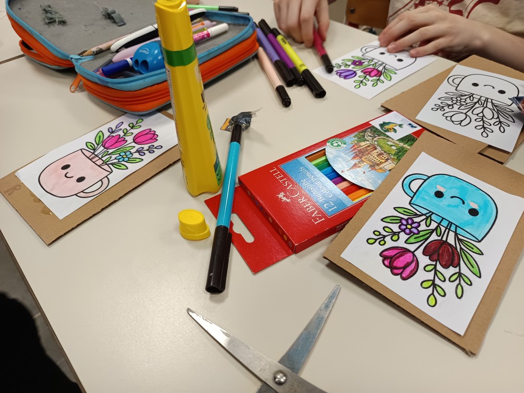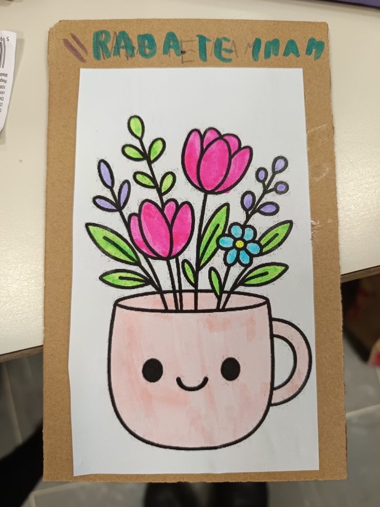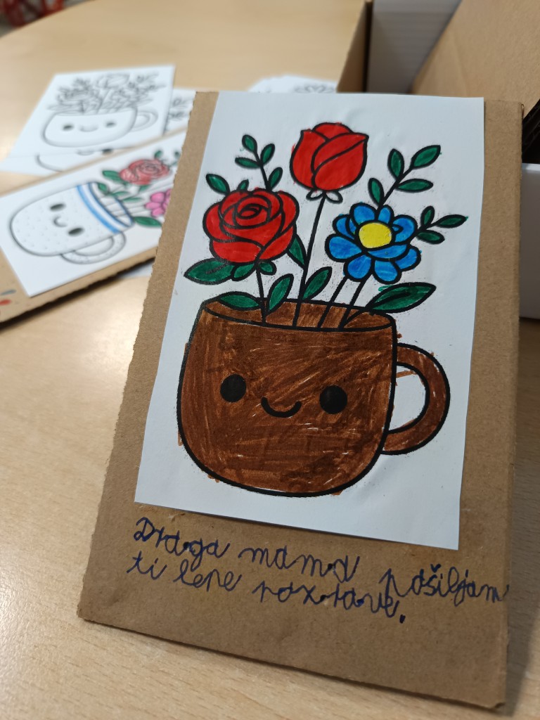 Ker imamo v naši skupini ponavadi le malo časa za ustvarjanje, smo se odločili za izdelavo preprostih voščilnic iz tršega kartona in manjših pobarvank. Lično smo pobarvali šopke, jih prilepili na kartonsko podlago ter poleg njih zapisali voščilo.