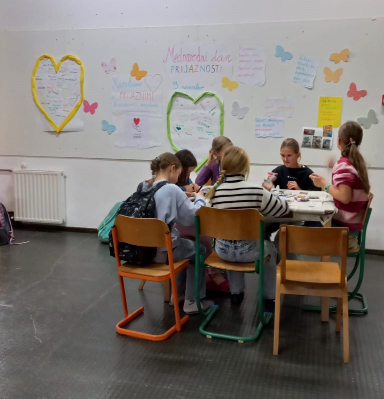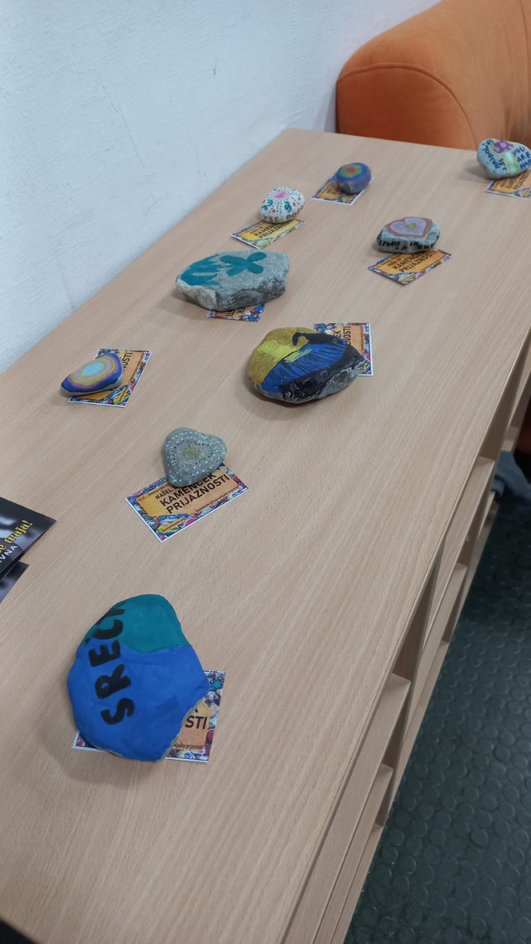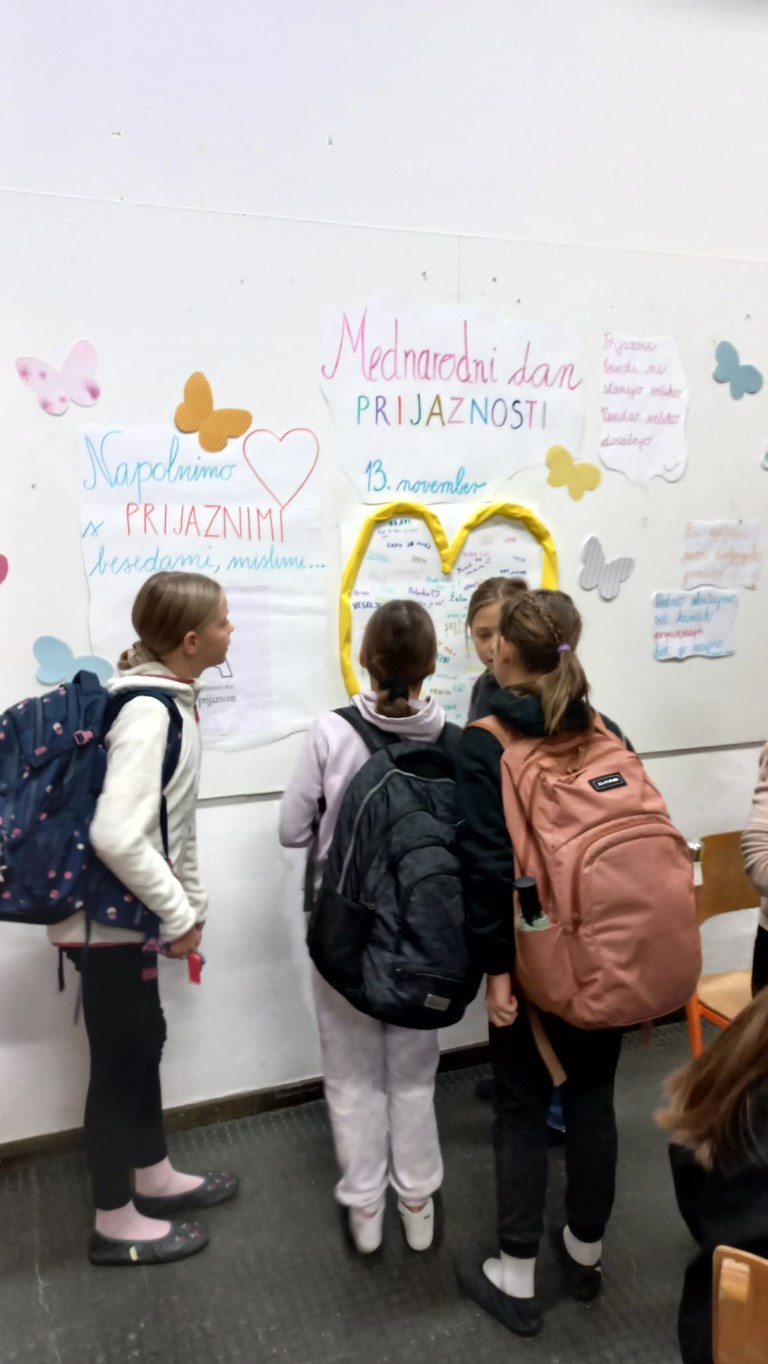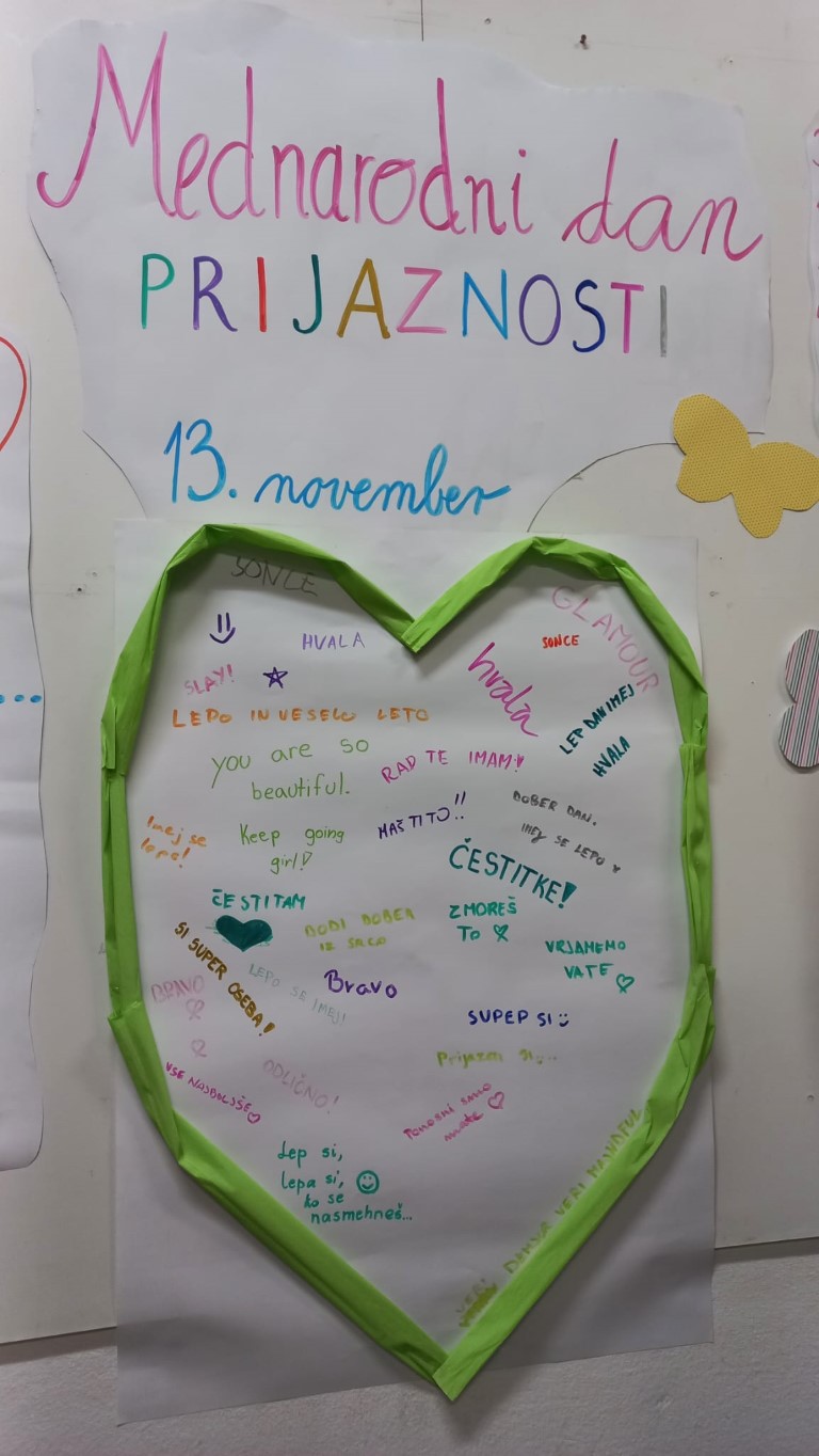 Vemo, da je biti prijazen nekaj, za kar se trudimo vsak dan. Prav zato, ker je to tako pomembno, a včasih tudi težko, obeležujemo mednarodni dan prijaznosti. Tako smo sredo, 13.11., začeli z jutranjo čajanko v kotičku dobrega počutja. Ob tem so učenke in učenci v veliko srce zapisovali prijazne misli in si iz škatle izbrali prijazno misel zase. Odziv je bil velik, zato smo nadaljevali v glavnem odmoru in napolnili še eno srce. V različnih razredih in po pouku smo izdelovali kamenčke prijaznosti, ki smo jih podarjali in jih postavljali na različne kotičke. Mogoče pa ste ga bili deležni ali na katerega naleteli?