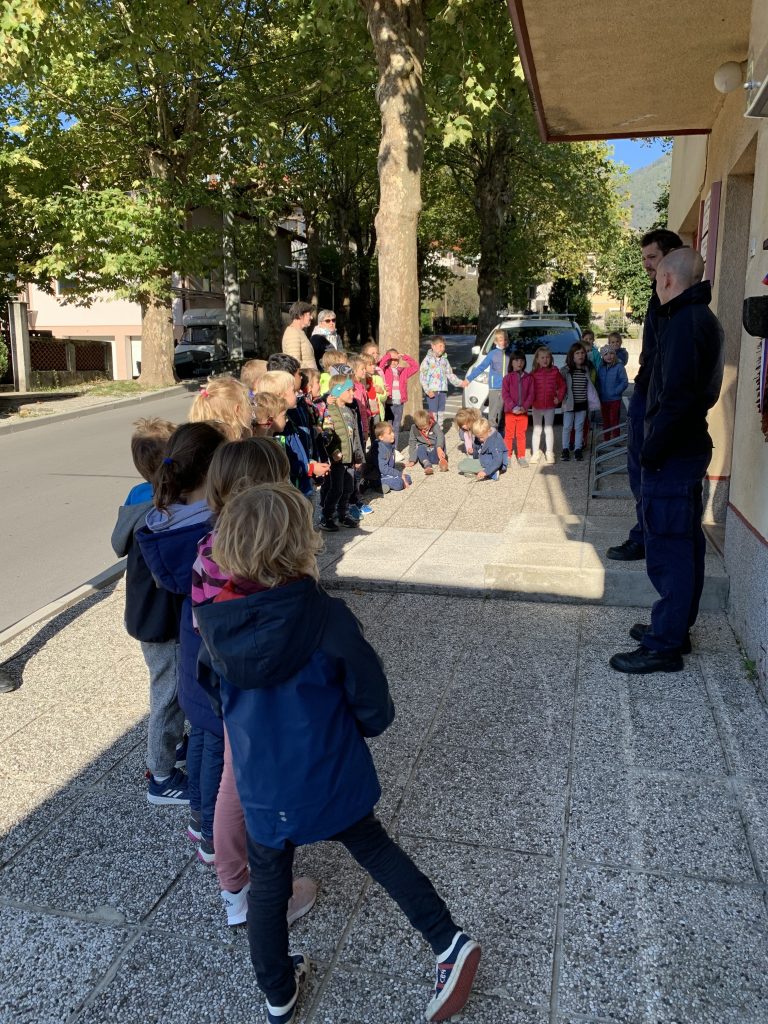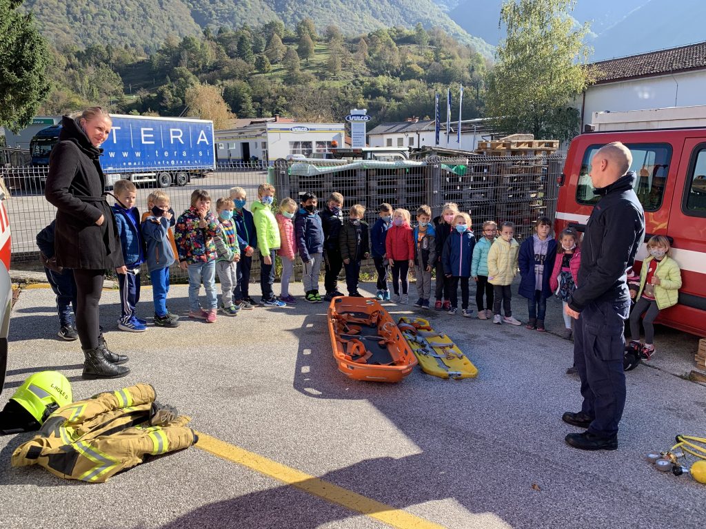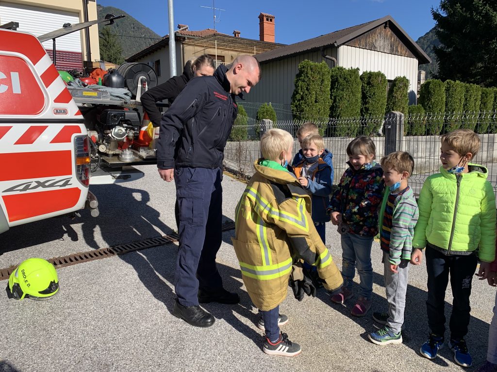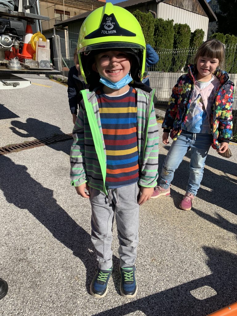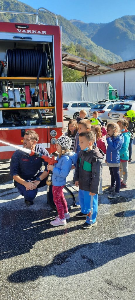 Po malici je sledil najlepši del dopoldneva. Odpravili smo se do gasilskega doma Tolmin, kjer nas je sprejel gasilec Miha. Popeljal nas je v notranjost gasilskega doma, kjer smo si ogledali kratek film o delu gasilcev. Po ogledu smo se razdelili v dve skupini. Spoznali smo gasilska oblačila in orodja, ki jih gasilci potrebujejo, da opravijo svoje delo. Nekatera orodja so bila za nas kar težka, zato smo jih preizkusili ob pomoči gasilca. Med drugim smo tudi izkusili potek dela gasilcev. Ker gasilci tudi gasijo požare, smo tudi mi z vodo pogasili namišljen požar. Pri tem smo zelo uživali.