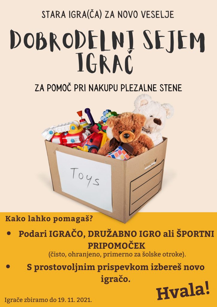 Približuje se mesec obdarovanja, zato bomo v mesecu novembru v okviru projekta Unescova priložnost: Stara igra(ča) za novo veselje in šolskega sklada načrtovali DOBRODELNI SEJEM za pomoč pri nakupu plezalne stene.