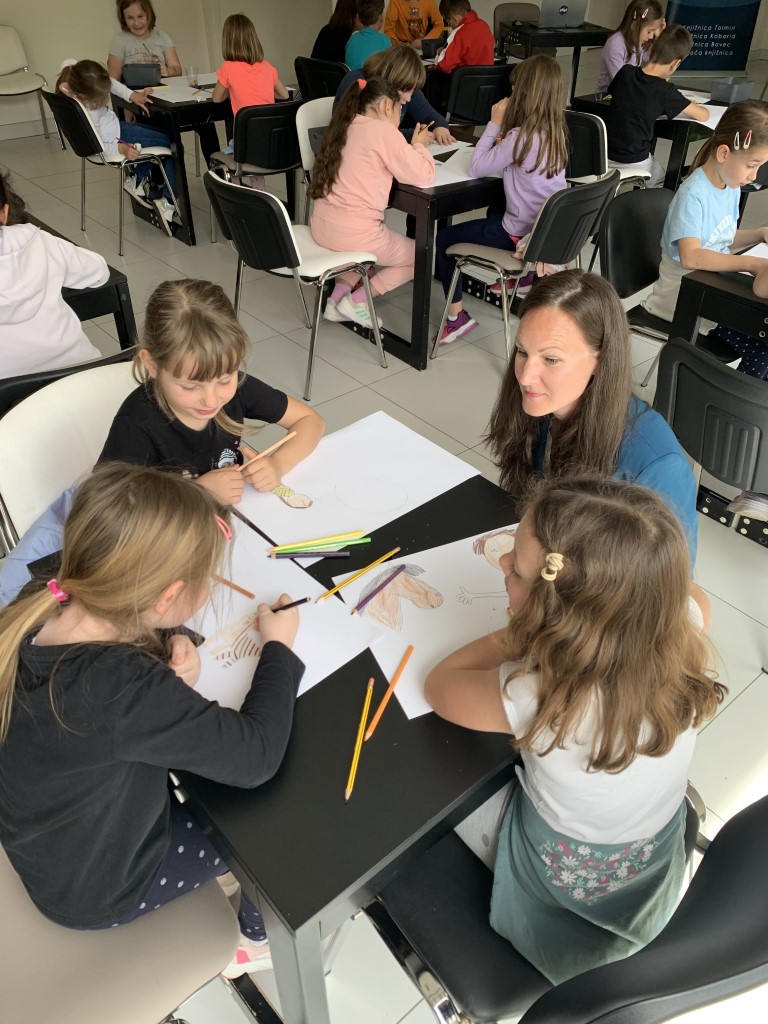 V četrtek, 9. maja, se je v knjižnici Cirila Kosmača Tolmin odvil zaključni dogodek. Knjižničarka Danjela Marcola je k sodelovanju povabila tudi drugošolce OŠ Franceta Bevka Tolmin. Vabilu smo se z veseljem odzvali, saj sta nas v knjižnici pričakali tudi mladinska pisateljica Tina Arnuš Pupis in ilustratorka Marta Bartol.