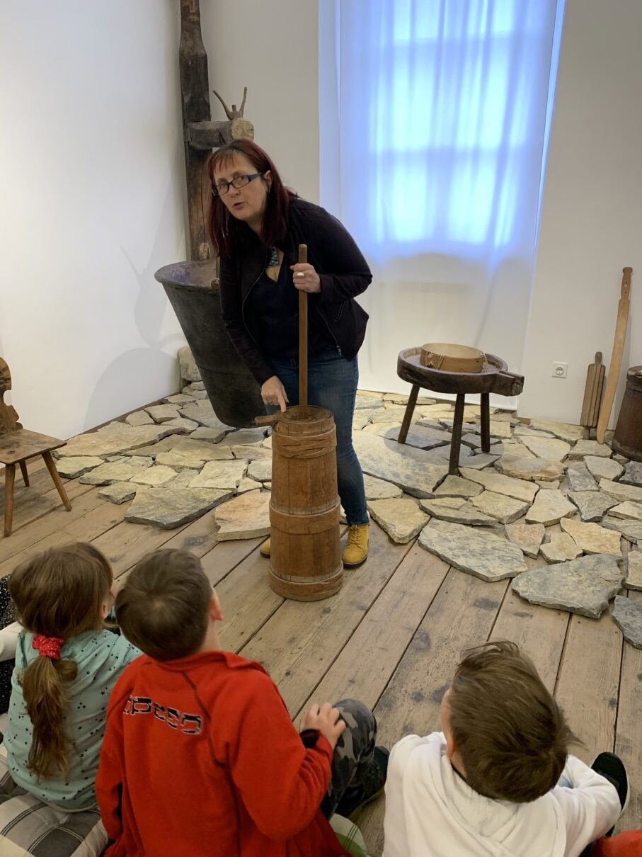 Včasih so ljudje veliko hrane pridelali doma, saj trgovin, kakršnih poznamo danes, ni bilo. Na Tolminskem so kmetje imeli krave. Mleko so uporabljali za pridelavo sira in pripravo masla. Pri tem so uporabljali prav posebno orodje. Ste že slišali za »trnač« in »pinjo«? Trnač so uporabljali za mešanje usirjenega mleka, pinja pa je bila posoda za izdelovanje masla.