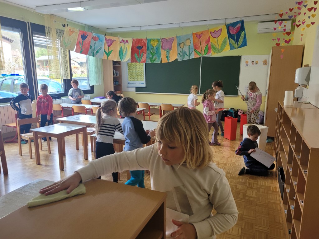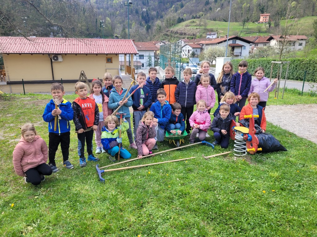Pomlad nas je že pozdravila in potrebno je bilo počistiti okolico šole in tudi razrede. Ker je bil 1. april in ker je bil vetroven dan, nam nihče ni verjel, da mislimo resno, in bomo očistili vse okoli šole in tudi po šoli. Zjutraj smo se najprej pogovorili o tem, kaj bomo počeli. Ogledali smo si krajši film o skrbi za okolje, pomalicali in nato poprijeli za orodje. Učenci so od doma prinesli motike, grablje, metle, samokolnico, stroj za čiščenje oken. Res neverjeten nabor orodja. Verjeli ali ne, tudi pridno so ga znali uporabljati. Okolica šole je bila hitro očiščena. Dekleta so očistila okenske police in pomila vsa okna. Fantje vse popleli, pometli in pobrali smeti. Kaj takega nismo verjeli. Naš gozdiček z igrali smo pregrabili, pobrali smeti, plevel, in kar je zelo pomembno, zopet smo uredili visoko gredo, KI NAM JO JE NEKAJ LET NAZAJ PODARIL TRIGLAVSKI NARODNI PARK IN SMO NANJO ZELO PONOSNI. Polna je zelišč, dišavnic in rožic. Nismo pa pozabili tudi na razrede. Vse police, mize so se sijale od čiščenja. Naše punce pa so očistile tudi zbornico, tako da se sije in diši. Učiteljice smo zelo ponosne na naše učenke in učence, saj so pokazali, da mladi še vedno znajo in zmorejo sodelovati, delati, pomagati, skrbeti za okolje. Bravo Volčani!