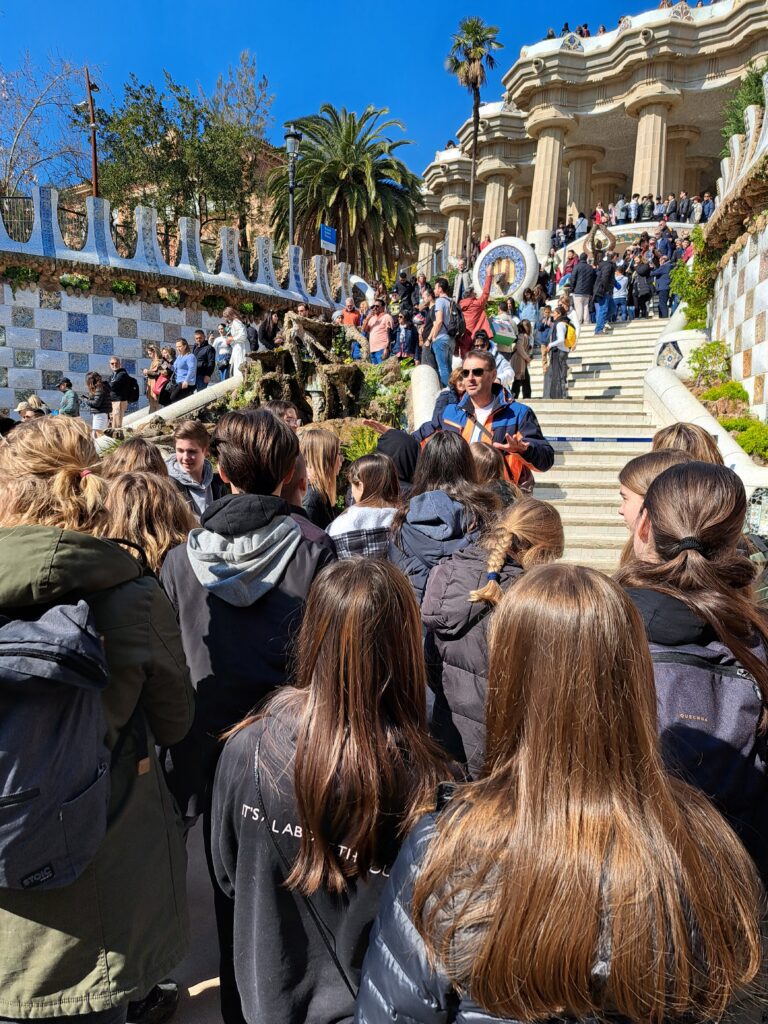 Po zdaj že dobro utečeni jutranji rutini smo se z avtobusom zopet zapeljali v Barcelono, natančneje v Parc Güell, mestni park, pod zasnovo katerega se je podpisal Antonio Gaudí. Navdušile so nas pisane barve, eksotične rastline in skulpture iz keramike, po katerih je Gaudí tako znan. V parku smo se odpočili na najdaljši klopi na svetu. Čeprav je betonska in oblepljena z razbitimi koščki keramike, je zelo udobna.