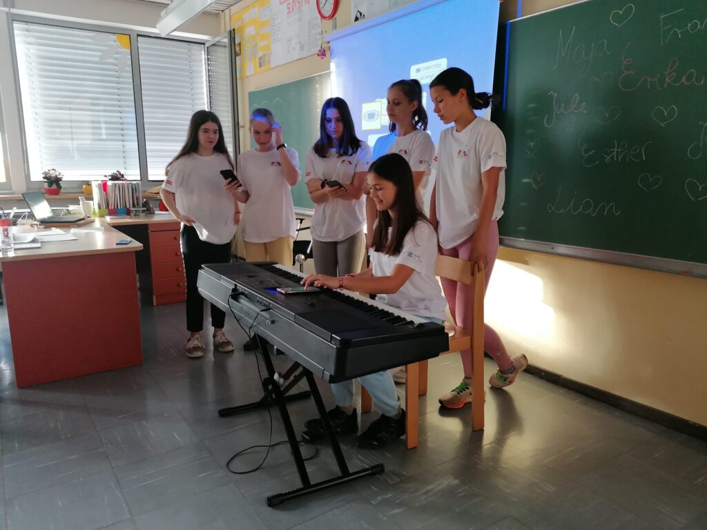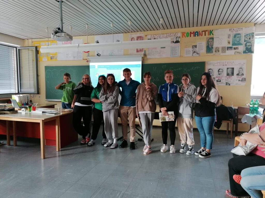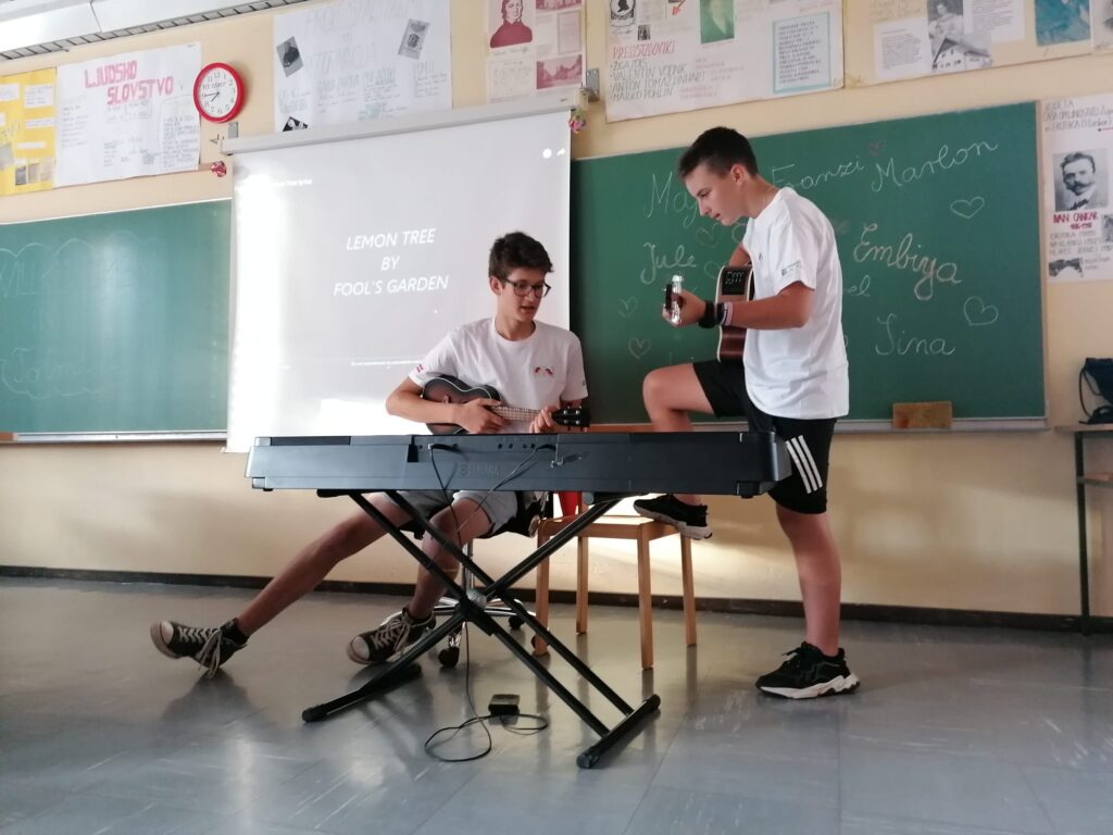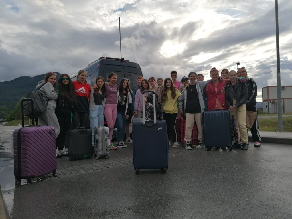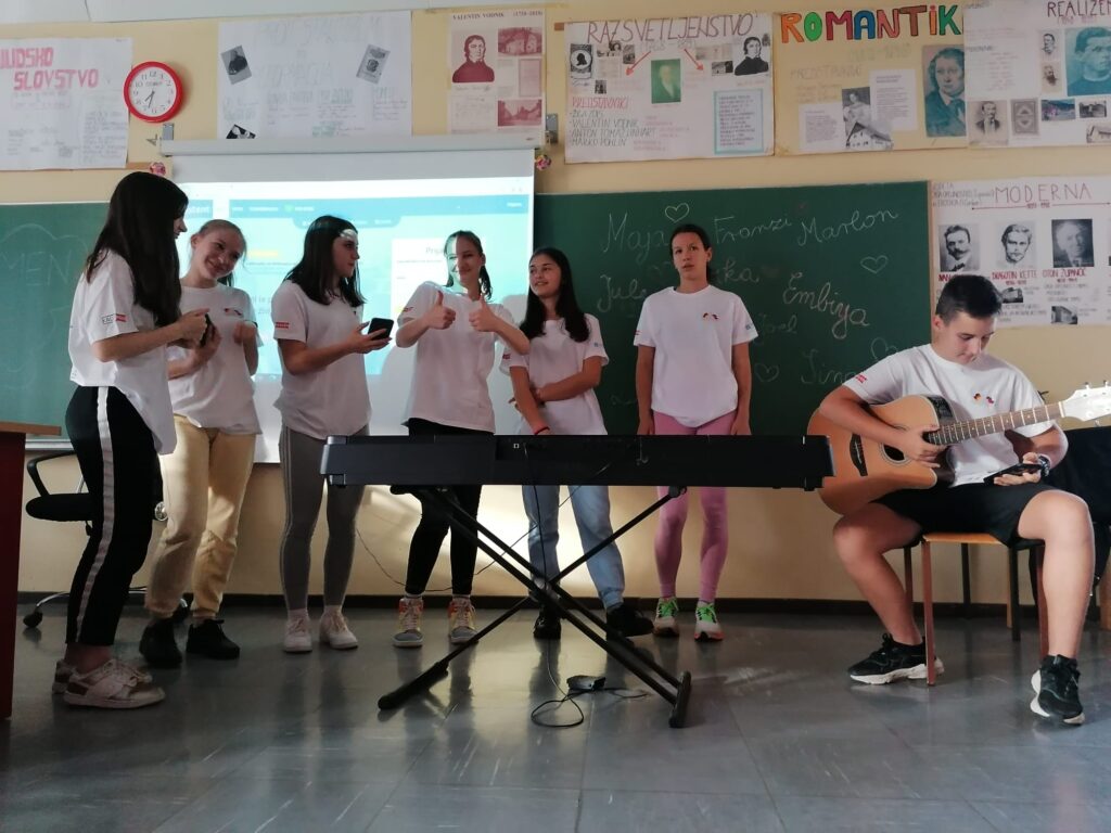 Nestrpno smo pričakovali prihod naših nemških prijateljev in ga končno tudi dočakali. Prisrčno smo se pozdravili in jim predstavili program dejavnosti, ki jih bodo doživeli v prihajajočem tednu. Presenetili smo jih s kar tremi glasbenimi točkami: zapeli smo jim uspešnico Country road, Dan ljubezni ob spremljavi kitare, Lian pa jim je zaigral tudi na ukulele. Zadrega je bila tokrat veliko manjša kot pri prvem srečanju v Nemčiji in kmalu smo sproščeno klepetali ob odličnem prigrizku. Posebej pa so se naši gostje zabavali ob videu, ki je prikazoval naše druženje v Nemčiji v začetku aprila. Z veseljem smo podoživljali vse dogodivščine takratne avanture. Polni pričakovanj po novih dogodivščinah smo se z nemškimi prijatelji odpravili k gostujočim družinam.