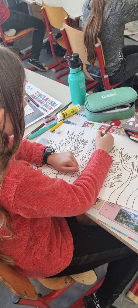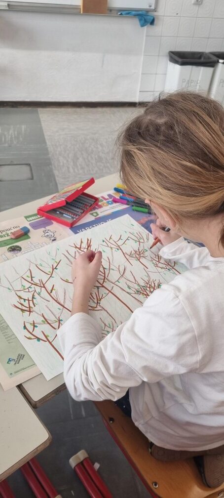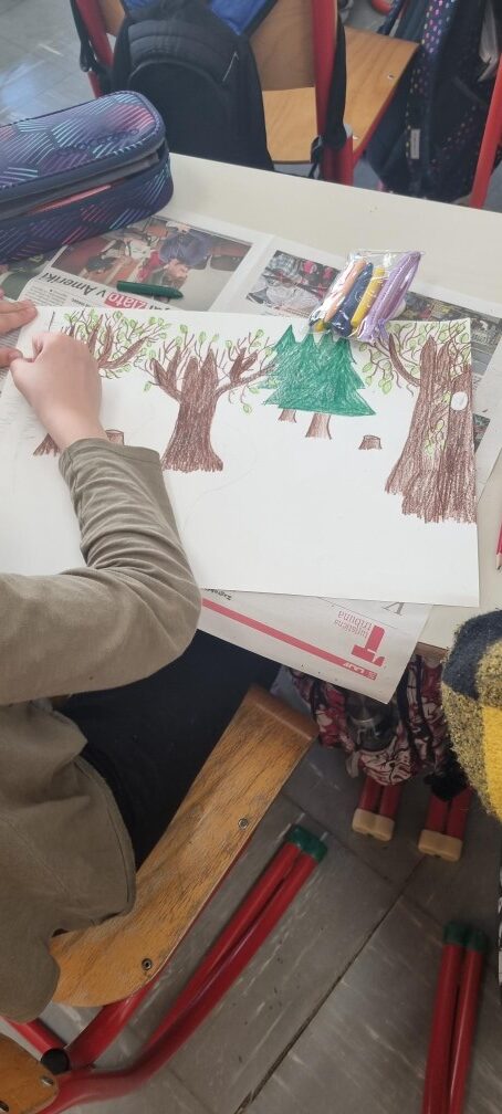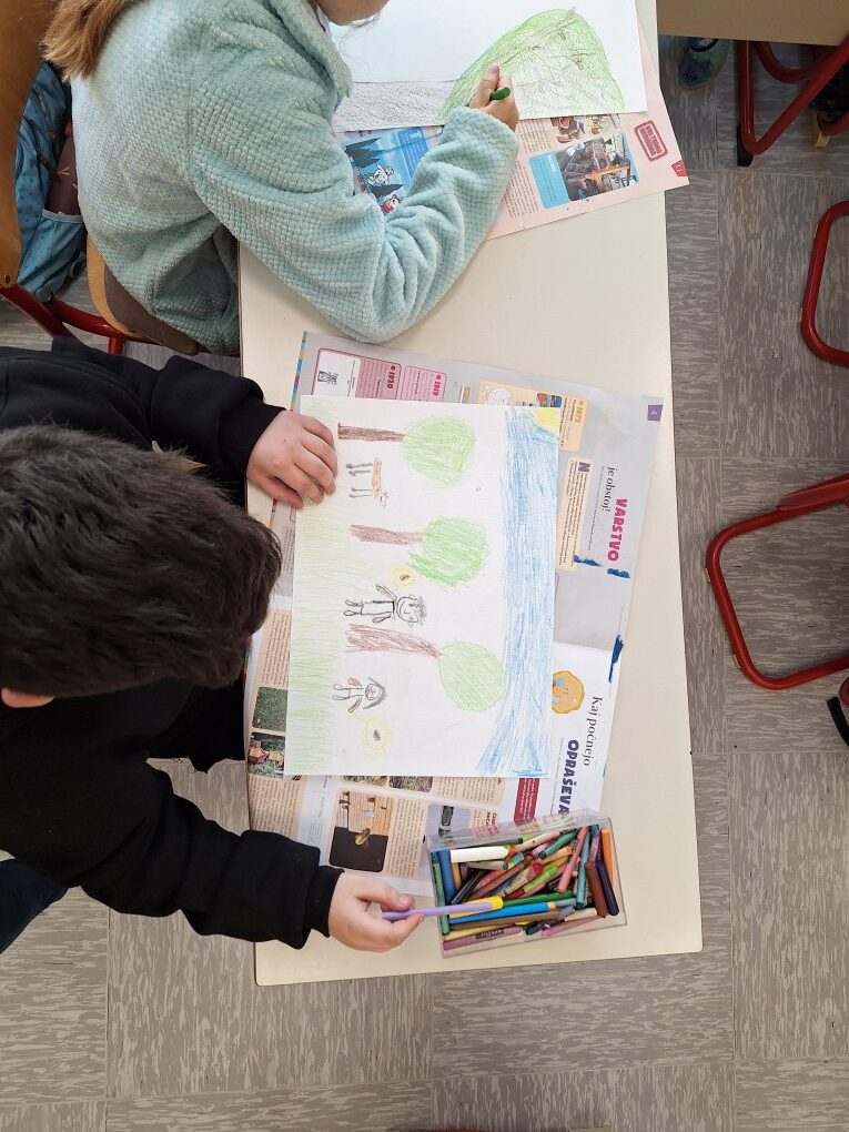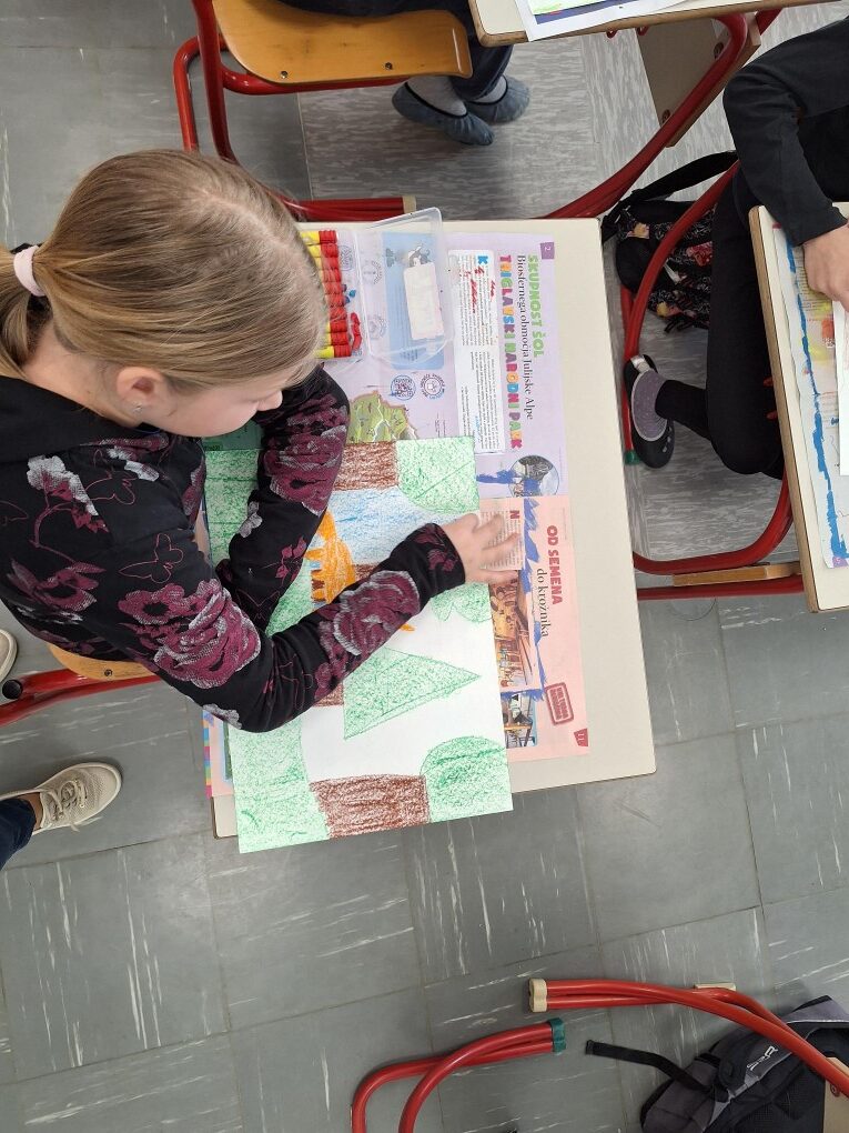 - gozd smo »prinesli« tudi v učilnico, kjer smo svoje občutke in videnje gozda poskusili izraziti z risanjem in slikanjem,
