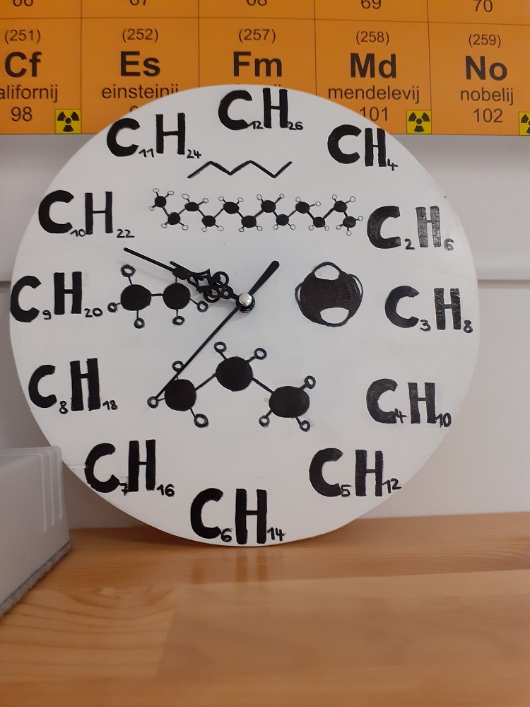 Učenci so si želeli izdelati tako uro, ki bi jo izobesili v učilnici kemije. V zimskih počitnicah jo je izdelal Črt Zega, vsebino pa je narisala Urša Skočir. Napisala je molekulske formule prvih dvanajstih alkanov, dodala modele.