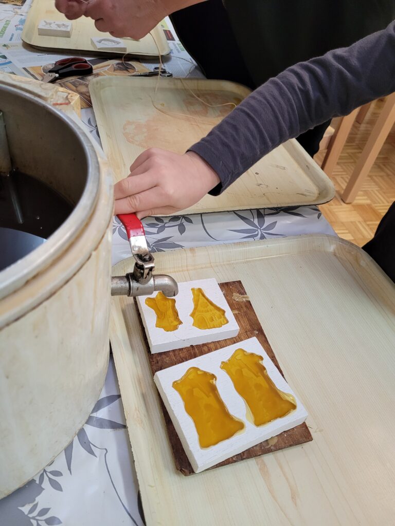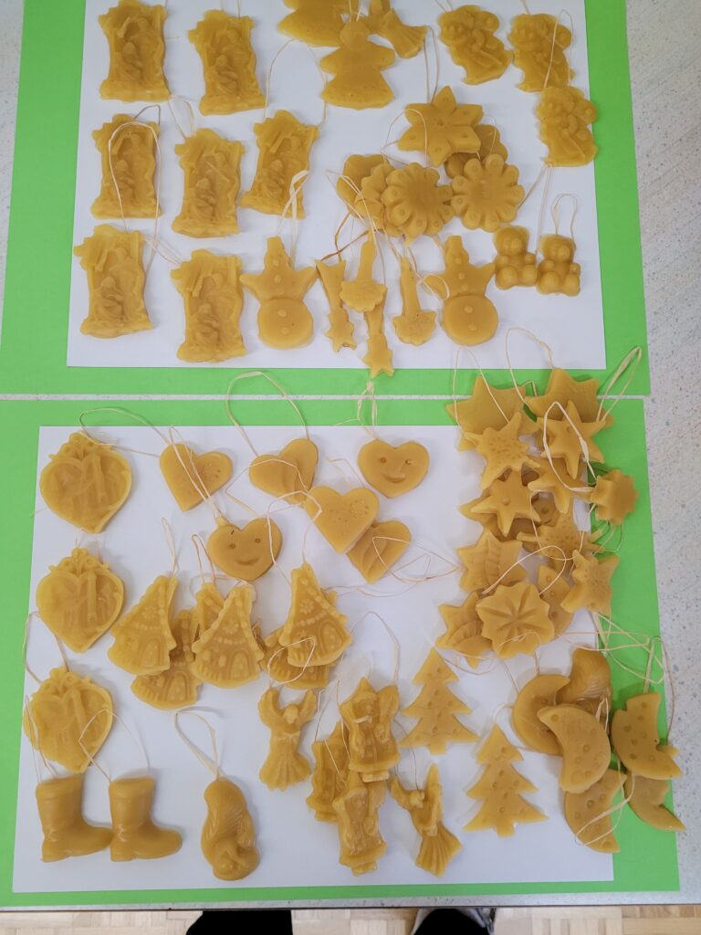 In kako so okusni. Seveda je preveč sladkega medu povzročilo, da nismo bili več na miru, zato smo s čebelarko začeli izdelovati obeske iz vročega voska. Tako smo uživali, da smo pozabili na uro. Poleg predstavitve in pokušine medu, so učenci izdelali tudi plakate o življenju čebel ter naslikali panjske končnice.