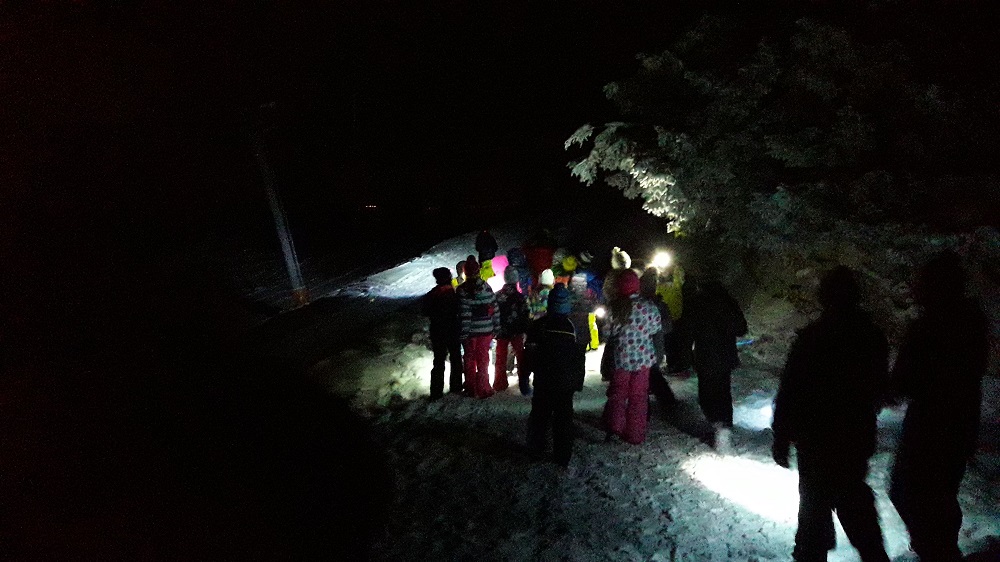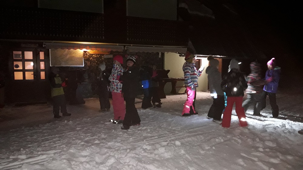 Zvečer smo šli na nočni pohod z baterijami. Ko smo hodili smo bili vsi zelo žejni. Šli smo do Penziona Tia. Tam smo popili čaj in se šli kepat. Za nazaj smo se metali v sneg in se kepali. Okepali smo učiteljico. Ko smo prišli nazaj v kočo, smo se preoblekli in šli takoj spat. Zelo je bilo lepo. (Taja in Laura)