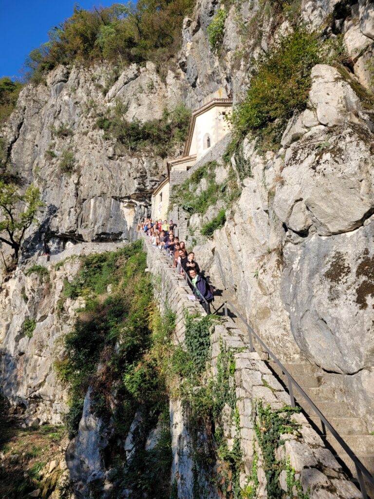 Tudi Landarska jama je nekaj posebnega. Najstarejši zapis sega v leto 888, zagotovo pa je bila znana in naseljena že prej. Najprej je v njej domoval jamski medved, nato kamenodobni človek. Kasneje je postala svetišče in zavetje pred različnimi napadalci: od Langobardov do Gotov, Hunov in Turkov. Učenci in učenke dvojezične šole so nam predstavili legendo o kraljici Vidi, ki se je pred Huni zatekla v jamo, gospod Massimo pa nam je razložil kasnejše arhitekturne posege v jami. Tu je Andrejeva kapela, cerkev pa so posvetili Janezu Krstniku in Evangelistu. S čeladami na glavi smo se podali še 300 metrov daleč v razsvetljeni rov.