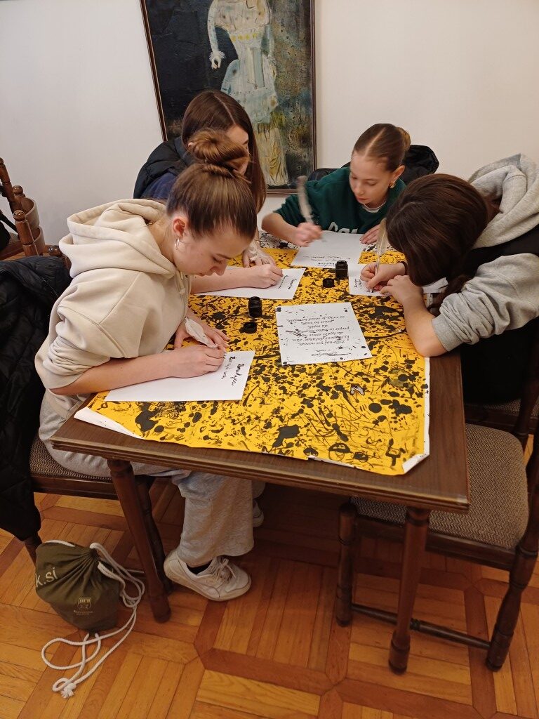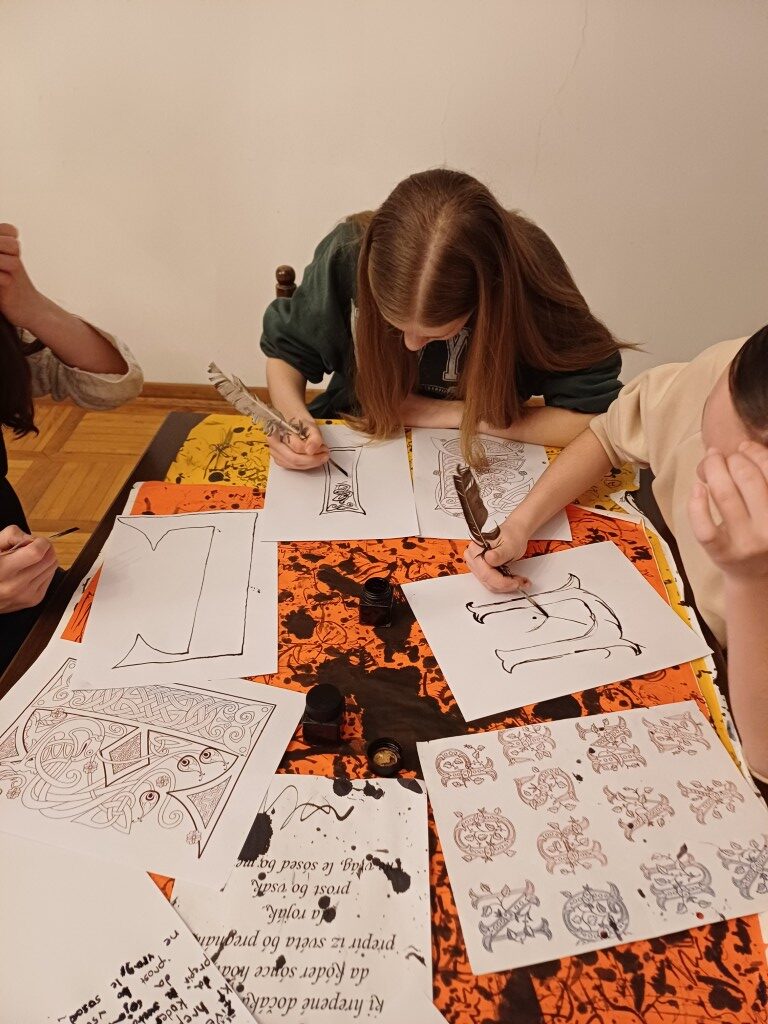 Nazadnje pa smo preizkusili še v pisanju z gosjimi peresi. Prepisati smo morali 7. kitico Zdravljice in zapisati črko svojega imena. Odlično nam je šlo!