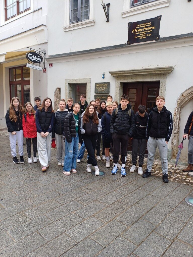 Pot smo nadaljevali proti Kranju, kjer smo si ogledali hišo, kjer je zadnja leta svojega življenja preživel naš največji pesnik France Prešeren. Hiša je danes spremenjena v muzej, tako da lahko začutimo utrip časa, v katerem je živel pesnik. V tej hiši je živel od jeseni 1846. leta do 8. februarja 1849, ko je pesnik umrl. Prav na dan njegove smrti leta 1964 pa je bil v tej hiši odprt spominski muzej. Hiša je sestavljena iz dveh delov in ima skupno dvorišče. Lahko si ogledamo bivalni del in tri spalnice: Prešernovo, spalnico sestre Katre in sobo Andreja Rudolfa, ki je bil pesnikov pisar. V sobah je ohranjeno tudi pohištvo, lepo pa je urejen tudi muzejski del, ki nas popelje skozi pesnikovo življenje in dela. V drugem delu hiše pa si lahko ogledamo Prešernovo pisarno, kjer je opravljal svojo odvetniško službo. V pritličnih prostorih je danes galerija. Lahko smo si ogledali vse upodobitve pesnika, a niti ena ni nastala v času njegovega življenja.