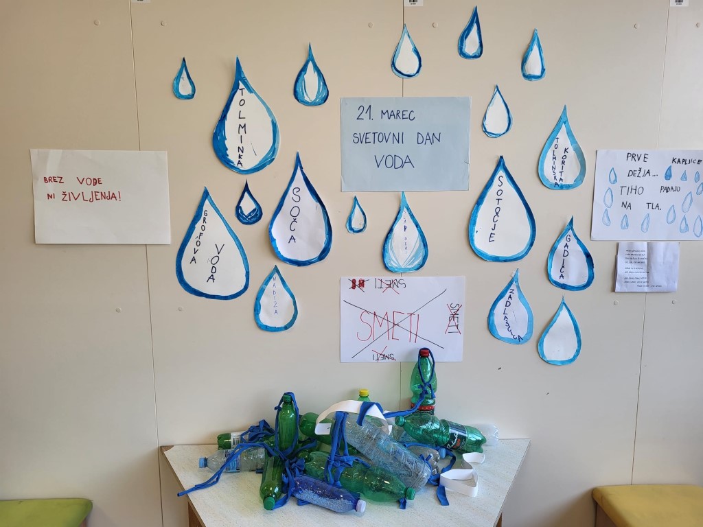 Mednarodni dan vode je razglasila Organizacija združenih narodov leta 1992. S tem dnevom so skušali vplivati na zavedanje ljudi o tem, kako pomembna je voda za življenje. Kljub temu veliko ljudi po svetu nima dostopa do čiste pitne vode. Svoje razmišljanje o vodi so razvijali tudi učenci 1. A razreda z učiteljicama Zalko in Tatjano ter učenci 4. A razreda pod mentorstvom učiteljice Špele Borovničar. Četrtošolci so si na temo – pomen čiste vode – ogledali kar nekaj filmov. Niso jih pustili ravnodušne, zato so se odločili, da se bodo preizkusili tudi v ustvarjanju. S svojimi izdelki so sodelovali v projektu Za čiste vode: odvrzi navado, ne odpadka, ki ga je organiziral Inštitut za vode RS. Prvošolci pa so pripravili razstavo, v katero so vključili poimenovanja bližnjih rek in potokov.