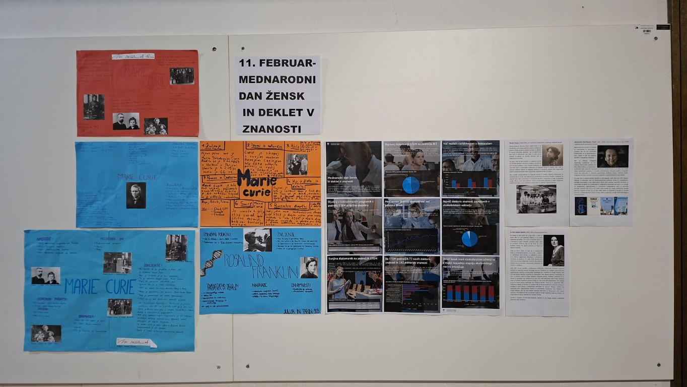 Oglasno desko so dopolnili tudi plakati, ki so jih ustvarili učenci pri izbirnem predmetu poskusi v kemiji. Večina plakatov je bila posvečena Marie Curie, eden pa je predstavil življenje in delo Rosalind Franklin, znanstvenice, ki je pomembno prispevala k razumevanju zgradbe DNK.
