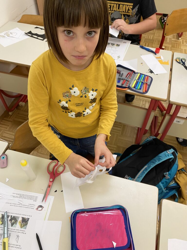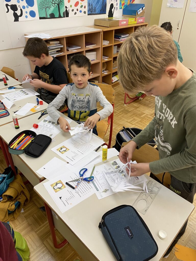 V torek, 5. 12., so imeli učenci 3., 4. in 5. razreda na PŠ Volče tehniški dan, kjer so ustvarjali iz papirja. Do malice so izrezovali odtise svojih rok na beli in zeleni podlagi, iz katerih so kasneje nastali venčki za vrata in zasnežene smrečice, ki krasijo glavni pano šole. Nato pa so po navodilu izdelali premikajočega pingvinčka in 3D okraske, ki so jih obesili po razredih. Za konec so učenci izrezovali še snežinke različnih oblik in velikosti. Ob izdelovanju izdelkov z zimskim motivom so poslušali božične pesmi, izpolnjevali pa smo tudi glasbene želje. Sledil je še zadnji del dneva – okraševanje šole in razredov ter ogled kratke božične risanke.