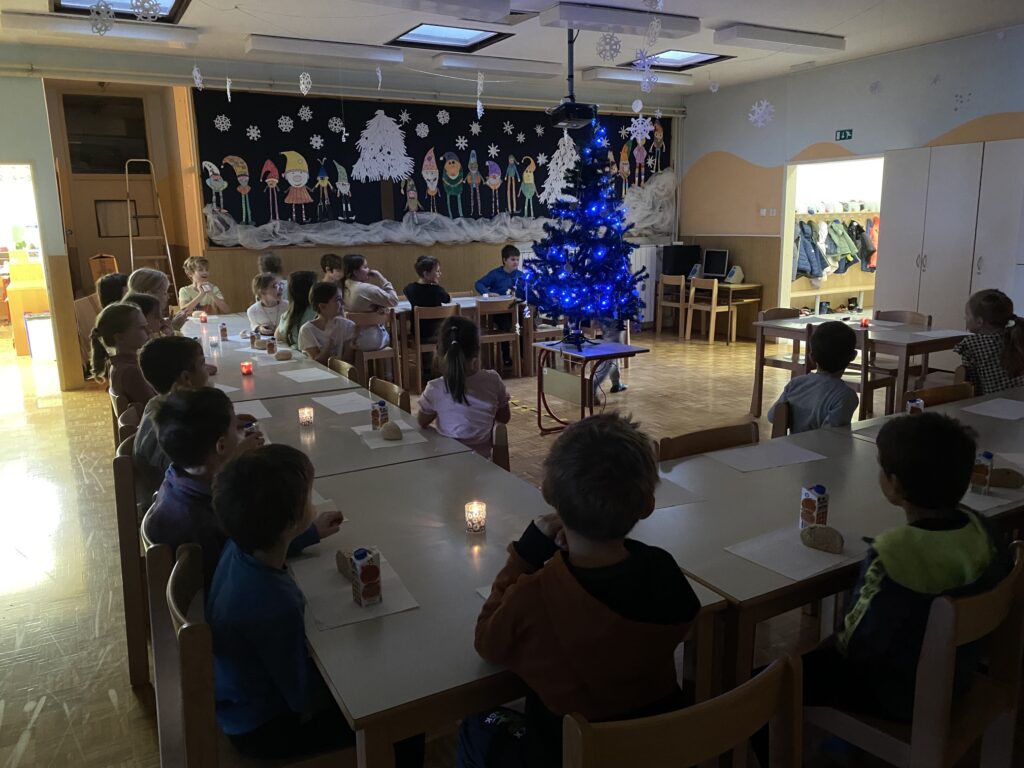 V četrtek je sledil slavnostni prižig lučk. Že pred poukom so učenci postavili smrečico in nanjo obesili okraske ter jo obogatili z lučkami. Pri malici smo na mizo dali svečke in v temi odštevali do prižiga lučk. Zdaj vedno pri malici jemo ob soju svečk in lučk na drevescu.