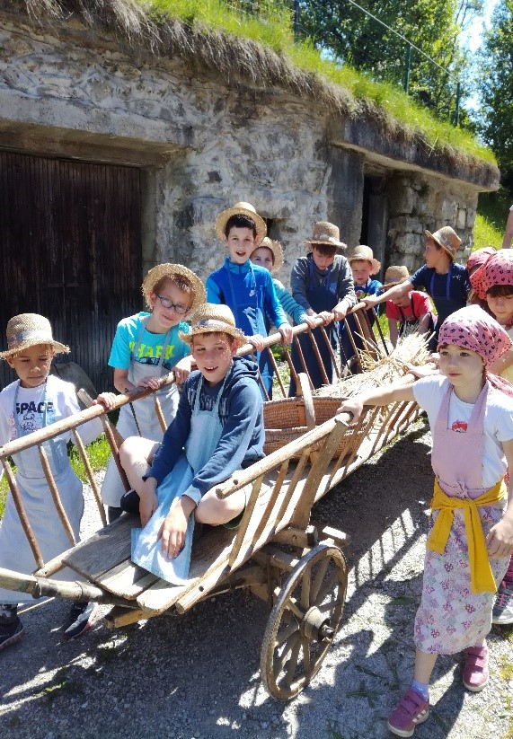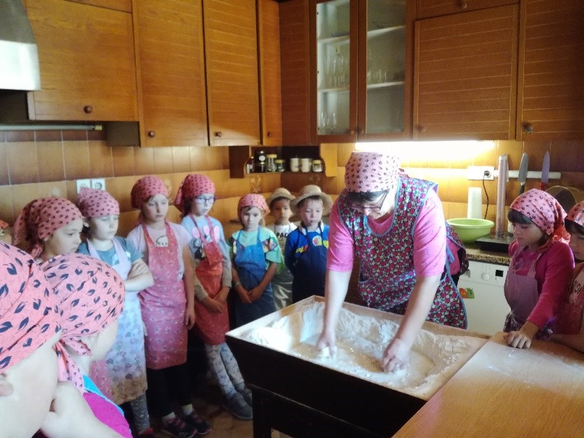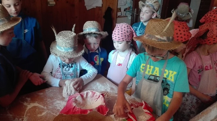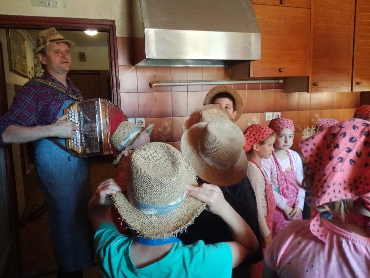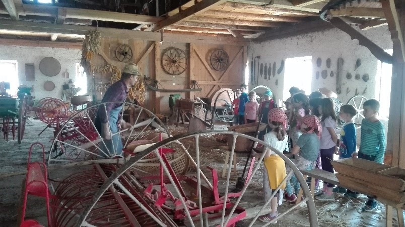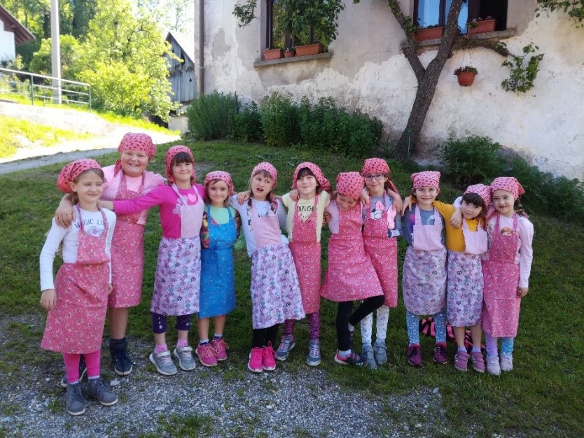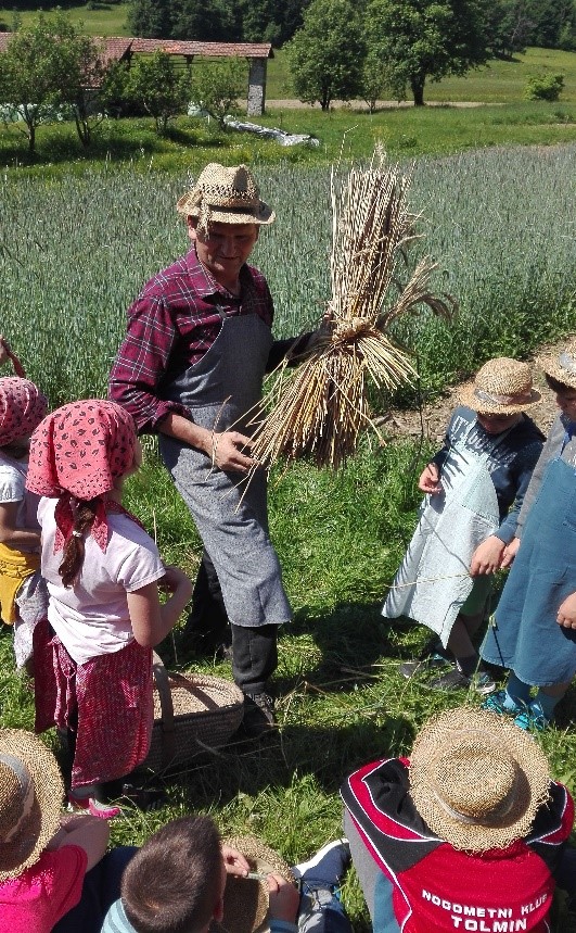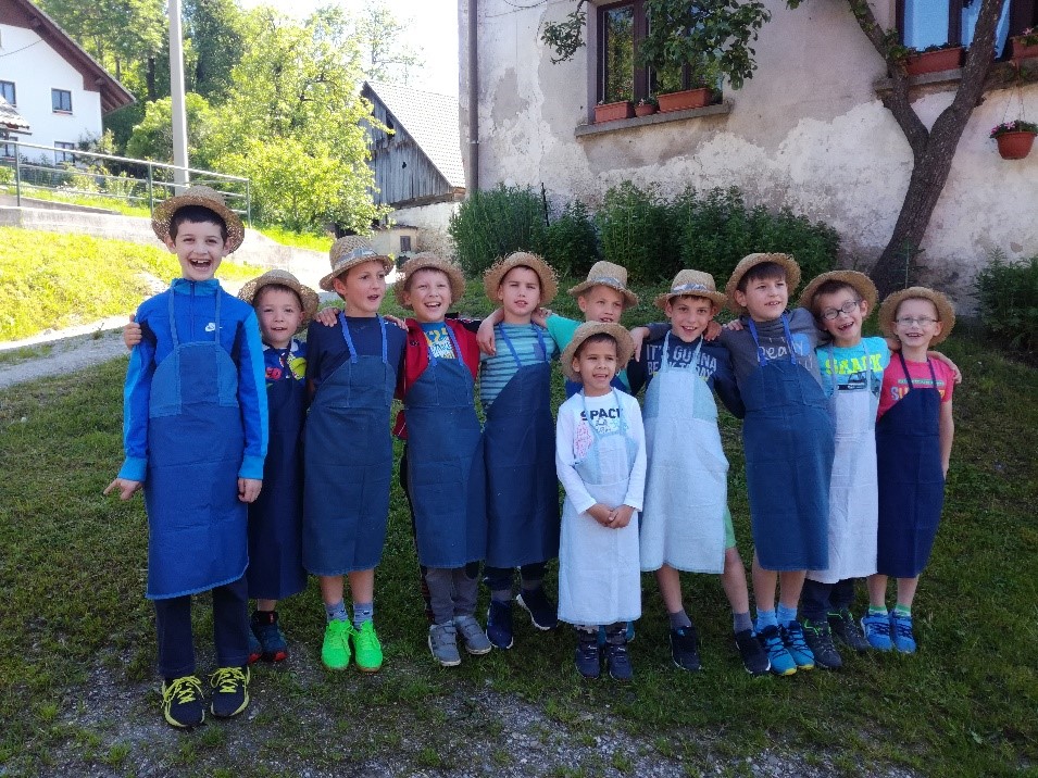 V torek smo odšli na Ledine. Ne samo, da je bilo vreme sončno, tudi vzdušje je bilo veselo. Ob prihodu nas je gospodar kmetije Pr’ Jureč lepo sprejel. Po malici smo skupaj z gospodinjo zamesili kruh in ga pustili vzhajati. Nato smo z vozom in orodjem odšli na polje, kjer raste pšenica. Slišali smo razlago, kako je potrebno to rastlino vzgajati, da jo jeseni lahko požanješ in zvežeš v snope. Nato smo se vrnili v hišo in vsak učenec je oblikoval svoj hlebček kruha. Gospodinja ga je dala v krušno peč, da se speče. Sledil je ogled muzeja, kjer smo videli stroje in orodja, ki so jih uporabljali nekoč. Žito smo mlatili, ločili plev, ga mleli,… in na starem skednju zaplesali ob zvokih harmonike. Sledila je malica, igra na igralih ob hiši; medtem je bil kruh pečen. Vsak učenec je dobil svoj hlebček in ga odnesel domov. Lepo je bilo preživeti dan na kmetiji in v prečudoviti naravi.