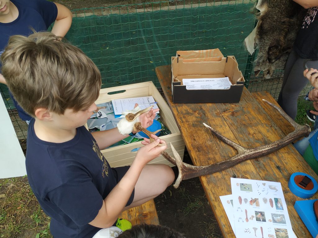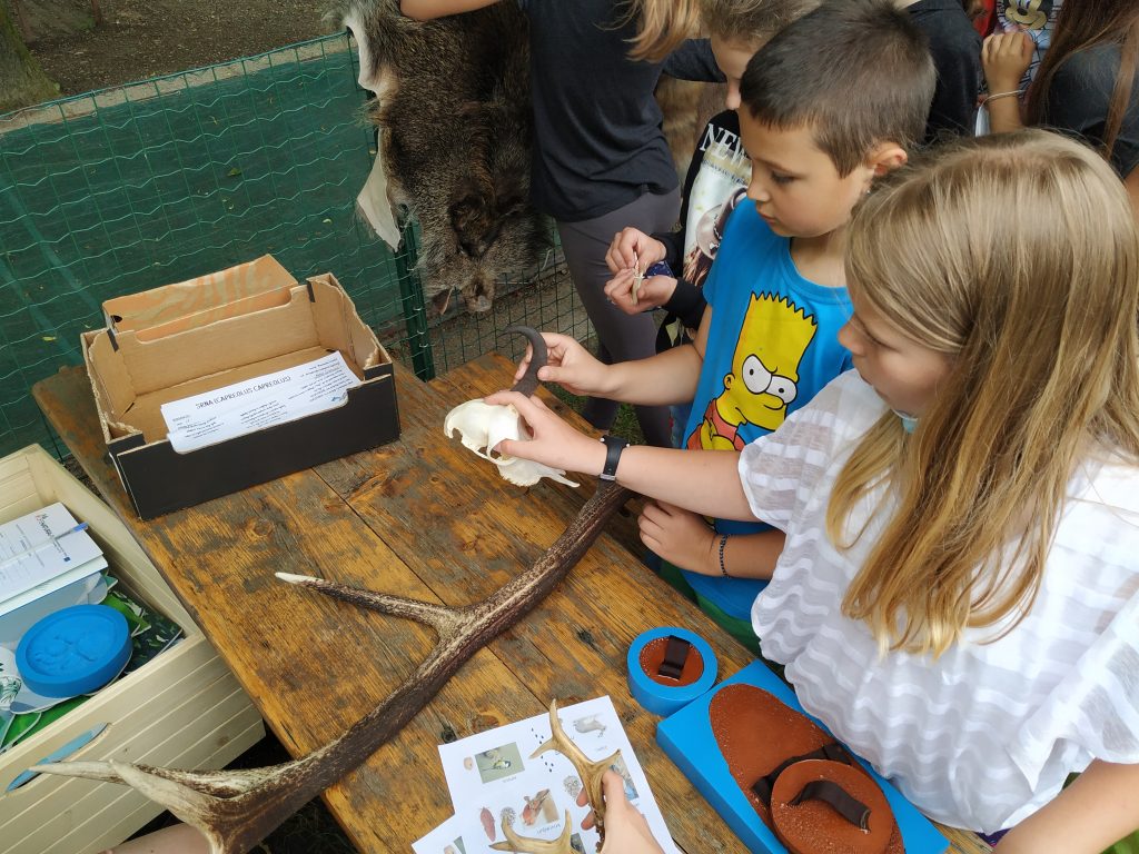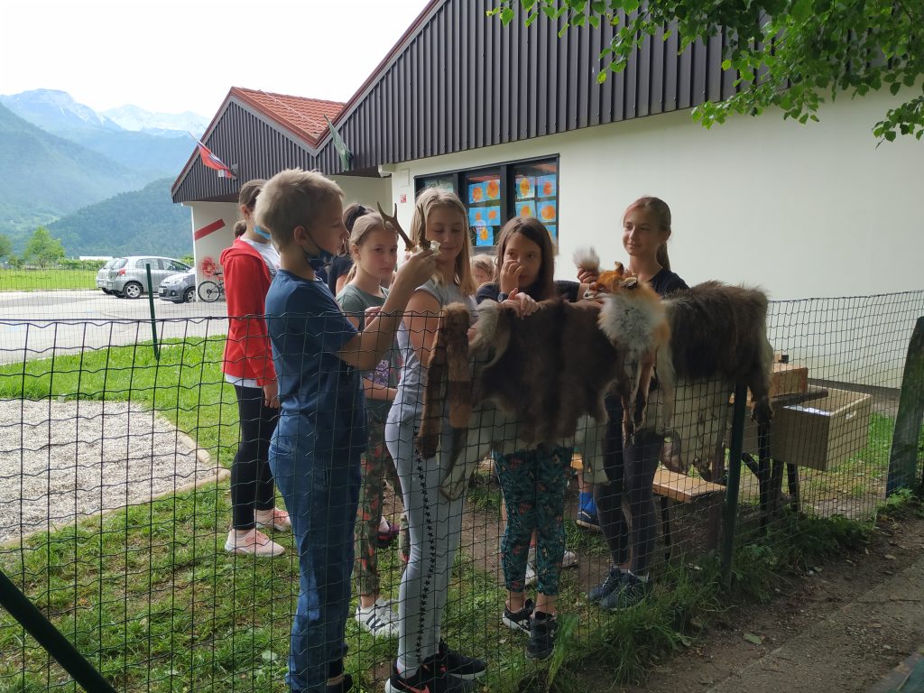 Gospa Maja nas je spodbudila, da smo uporabili vse čute pri opazovanju sledi, ki jih puščajo živali. Začutili in videli smo kako miš obgrize storž. Opazovali smo, na kakšen način pridejo veverica, miš ali voluharica do lešnikovega jedrca. Povohali smo gamsov iztebek, videli zajčje bobke, pobožali lisičjo in gamsjo kožo ter kožo divjega prašiča. Dvignili smo jelenovo rogovje.