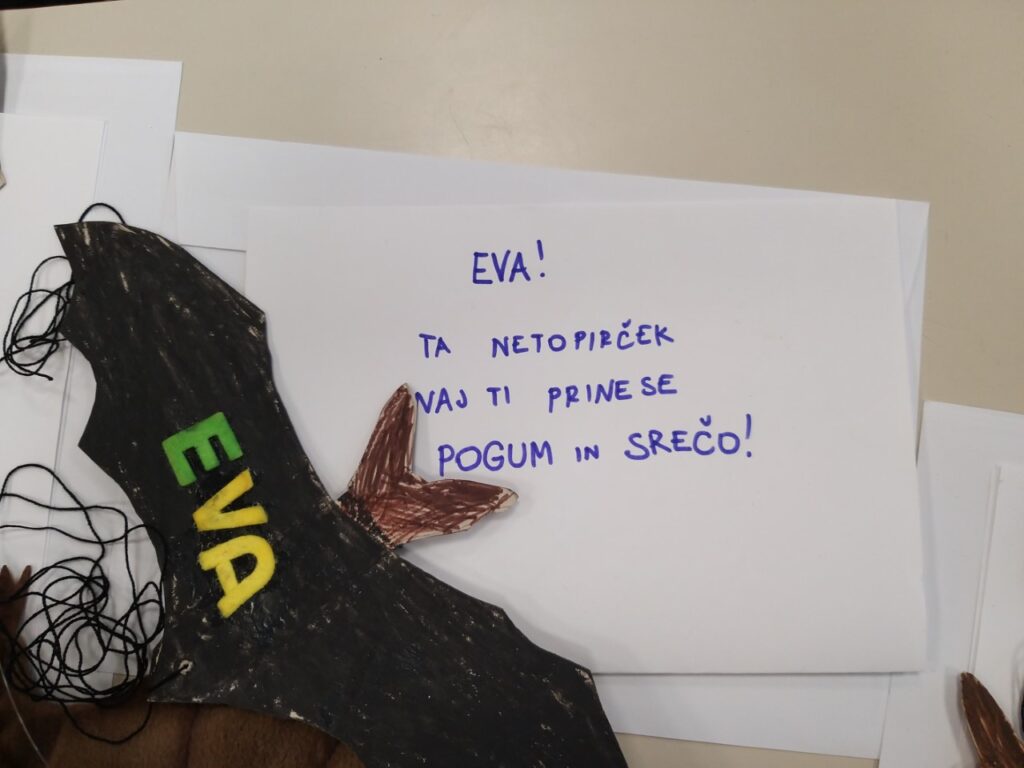 Izbrali smo nekaj otrok in zanje izdelali netopirje, ki jih bodo obesili nad posteljo v bolnici ali doma. Na prhuti smo napisali otrokovo ime in izštevanko, ki bo bodrila male borce, da bodo še bolj pogumni: