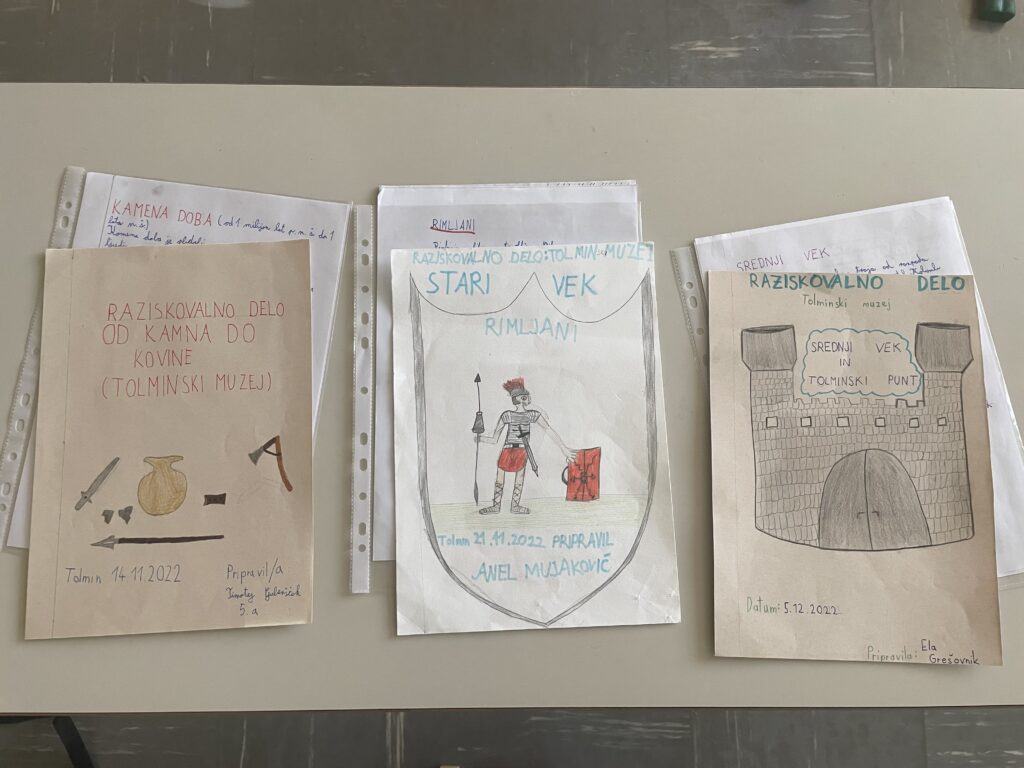Učenci 5. a, b, c razreda so v okviru družbe odkrivali značilnosti zgodovinskih obdobji na Tolminskem in sicer od neolitika do Tita kot jih je poimenovala kustosinja Karla. Tolminski muzej smo obiskali kar štirikrat in tam preživeli kar veliko zanimivih ur. Vse značilnosti in zanimivosti so učenci predstavili tudi v raziskovalnih nalogah.