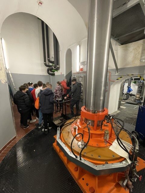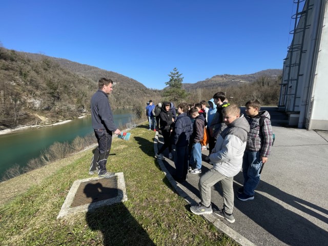 V okviru programa za razvoj potencialov in nadarjenosti smo tokrat pozornost namenili tehničnemu področju. V četrtek, 20. 2. 2025, smo si ogledali del soških hidroelektrarn: pregrado Ajba, HE Plave in ČHE Avče. Na pregradi Ajba so nas sprejeli zaposleni in nas popeljali po samem jezu, razložili princip delovanja in pokazali manjši generator. Iz pregrade Ajba sta namreč speljana 6 kilometrska tunela, do elektrarn v Plavah, do koder smo se nato tudi odpeljali. Tam smo si ogledali turbine in generatorje elektrarne ter starejšo nadzorno sobo, iz katere so pred »digitalizacijo« upravljali elektrarno. Impozanten tunel in glavni prostor elektrarne na obiskovalca naredijo vtis, posebej ob dejstvu, da so bili izkopani pred drugo svetovno vojni v treh letih, z veliko manj tehnologije kot jo imamo danes. V zadnjem delu smo se zapeljali do črpalne hidroelektrarne Avče. Zaposleni so nam razložili princip delovanja, po katerem celotna elektrarna deluje kot hranilnik energije. V terminih z nižjo ceno električne energije črpa vodo na Kanalski vrh, v časih z višjo ceno pa jo proizvaja. Poučna ekskurzija je hitro minila. Ob koncu rad zahvalil zaposlenim v Soških elektrarnah, ki so nam omogočili vstop in ogled.