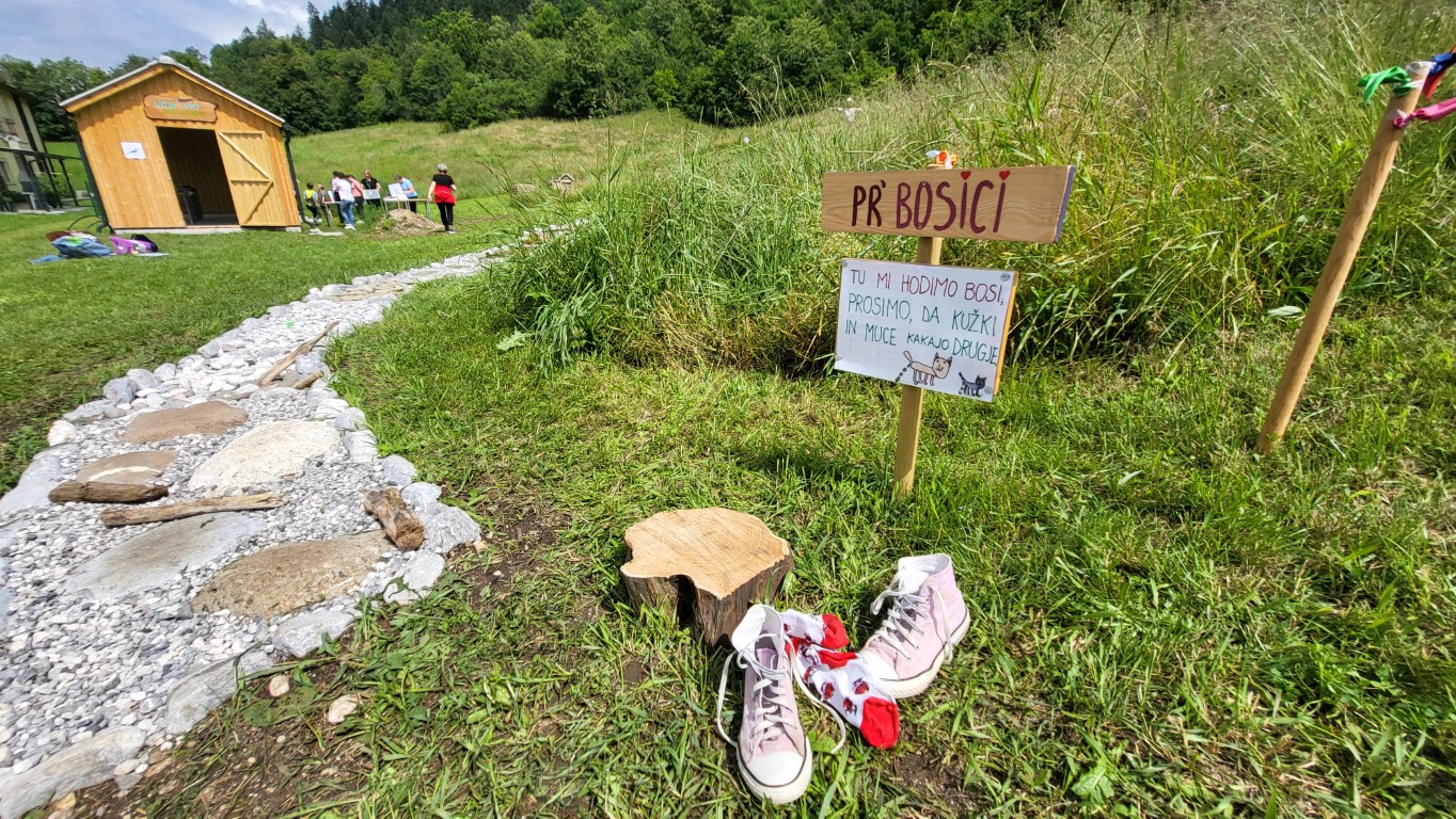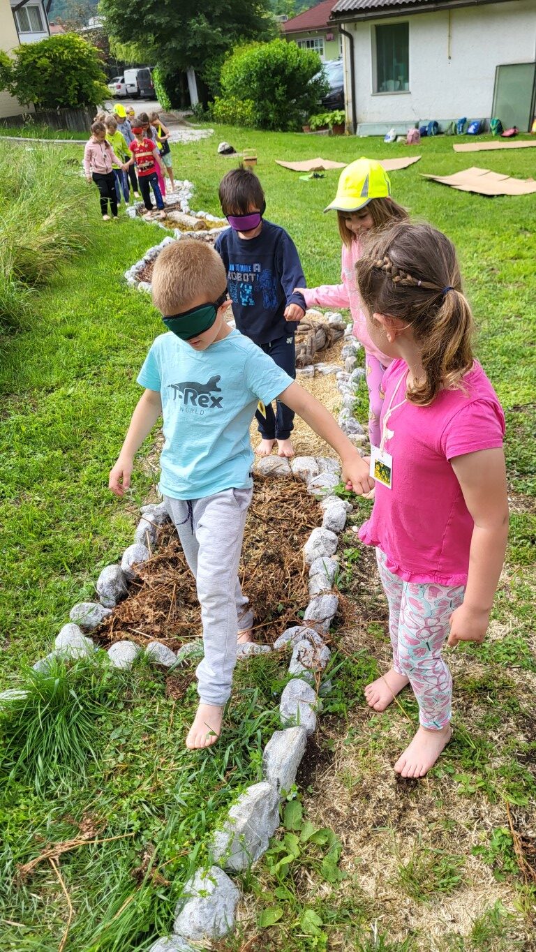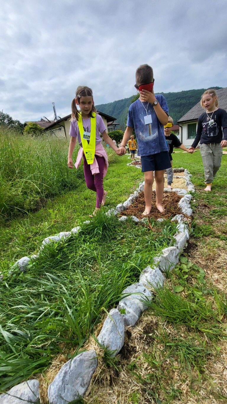 Najbolj pa so bili učenci navdušeni, ko so bosi stopali po čutni stezi Bosici. Steza ima 14 prekatov. V vsakem je drugačen naravni material. Od prodnikov, gline, sena, slame, lubja, praproti, storžev, skrilavcev in drobnih vejic. Veselili so se tudi, ko so s prijateljem v roki in z zavezanimi očmi bosi stopali po stezi.