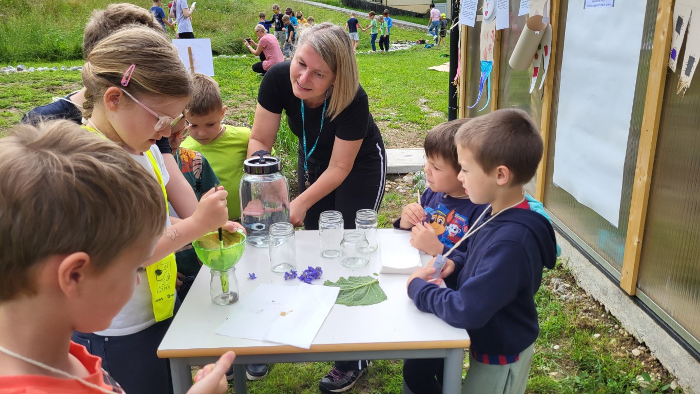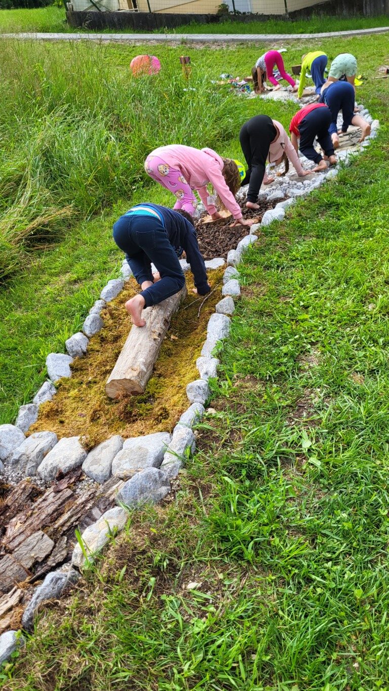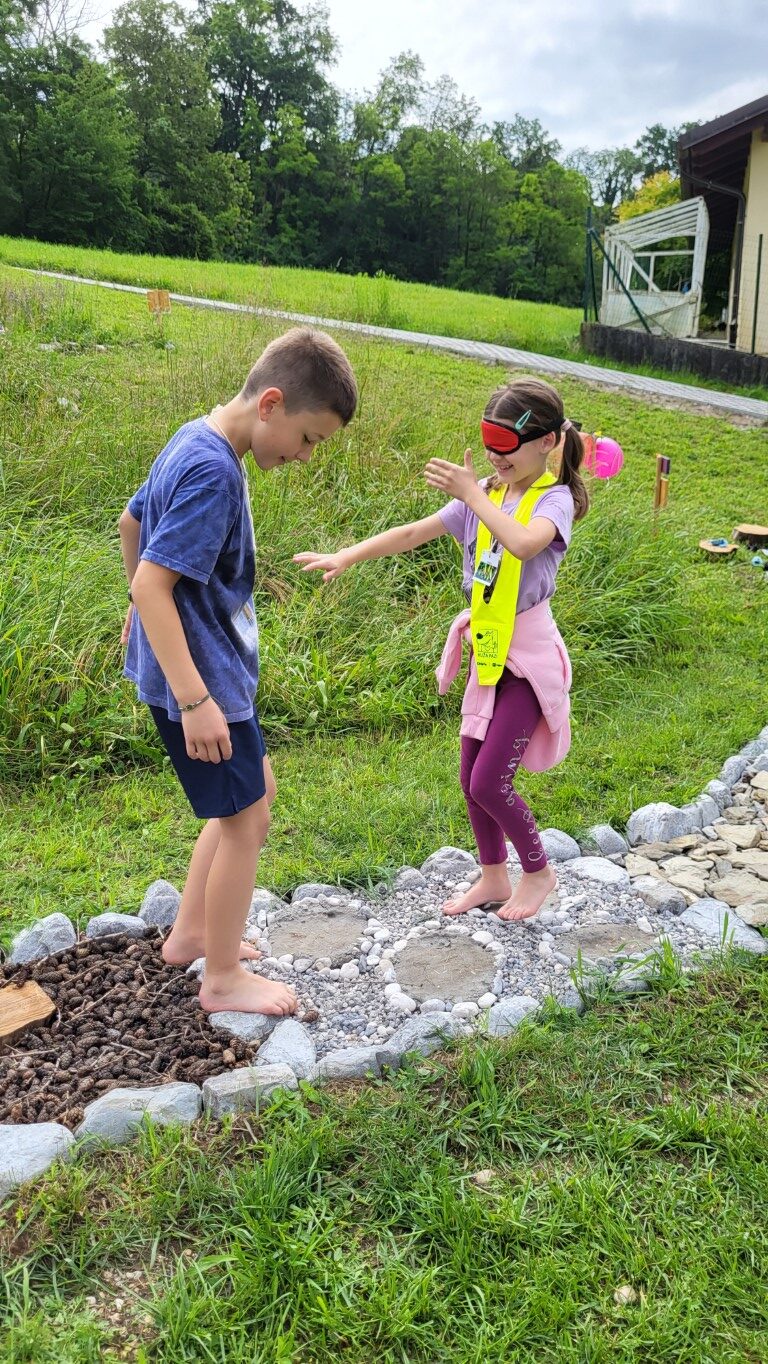 Najbolj pa so bili učenci navdušeni, ko so bosi stopali po čutni stezi Bosici. Steza ima 14 prekatov. V vsakem je drugačen naravni material. Od prodnikov, gline, sena, slame, lubja, praproti, storžev, skrilavcev in drobnih vejic. Veselili so se tudi, ko so s prijateljem v roki in z zavezanimi očmi bosi stopali po stezi.