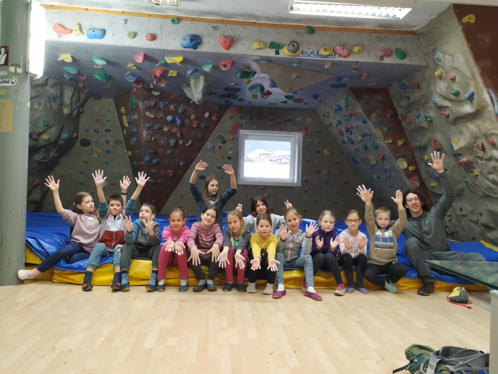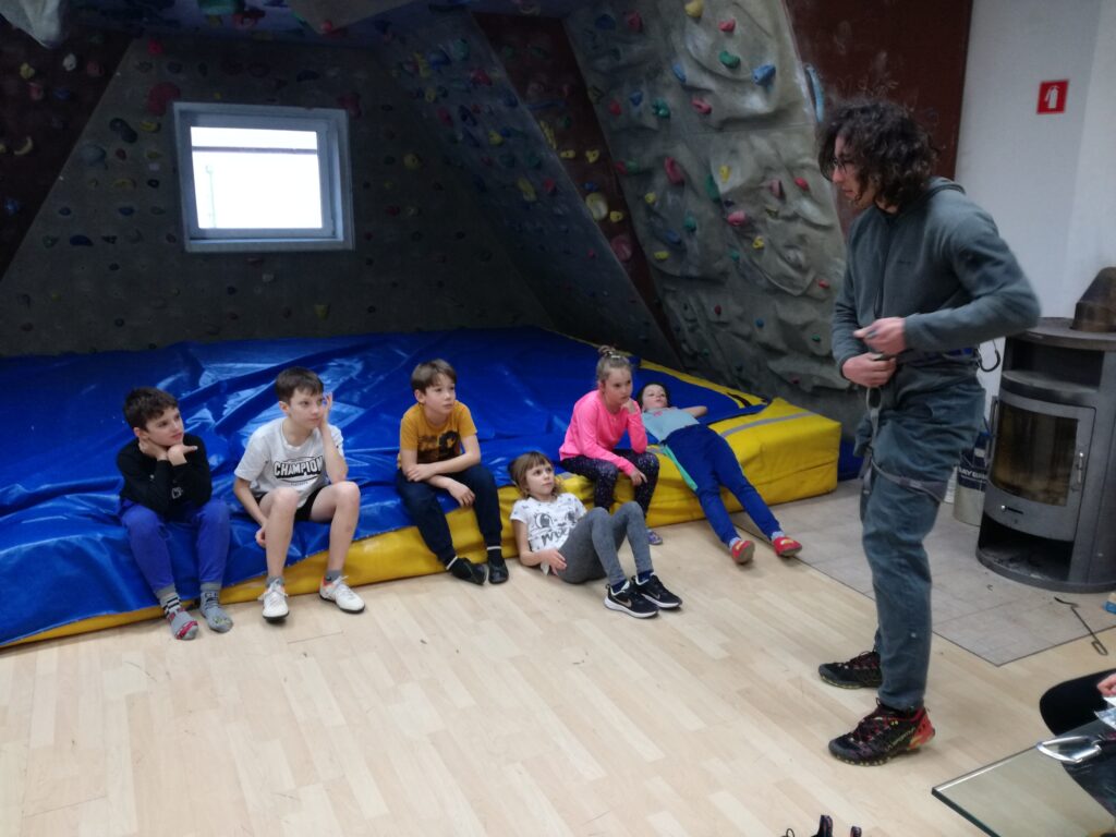 Član Soškega alpinističnega odseka PD Tolmin Gregor Manfreda je učence najprej ogrel od glave do prstov na nogah. Nato so spoznali osnove plezanja, plezalno opremo in varnost pri plezanju.