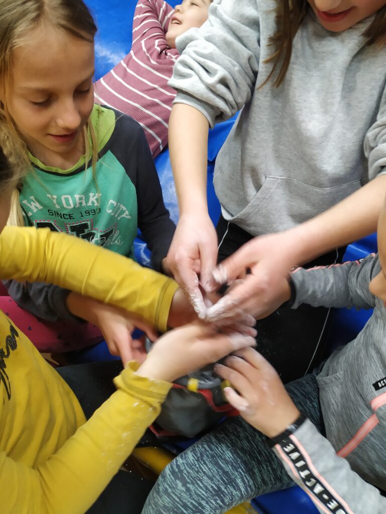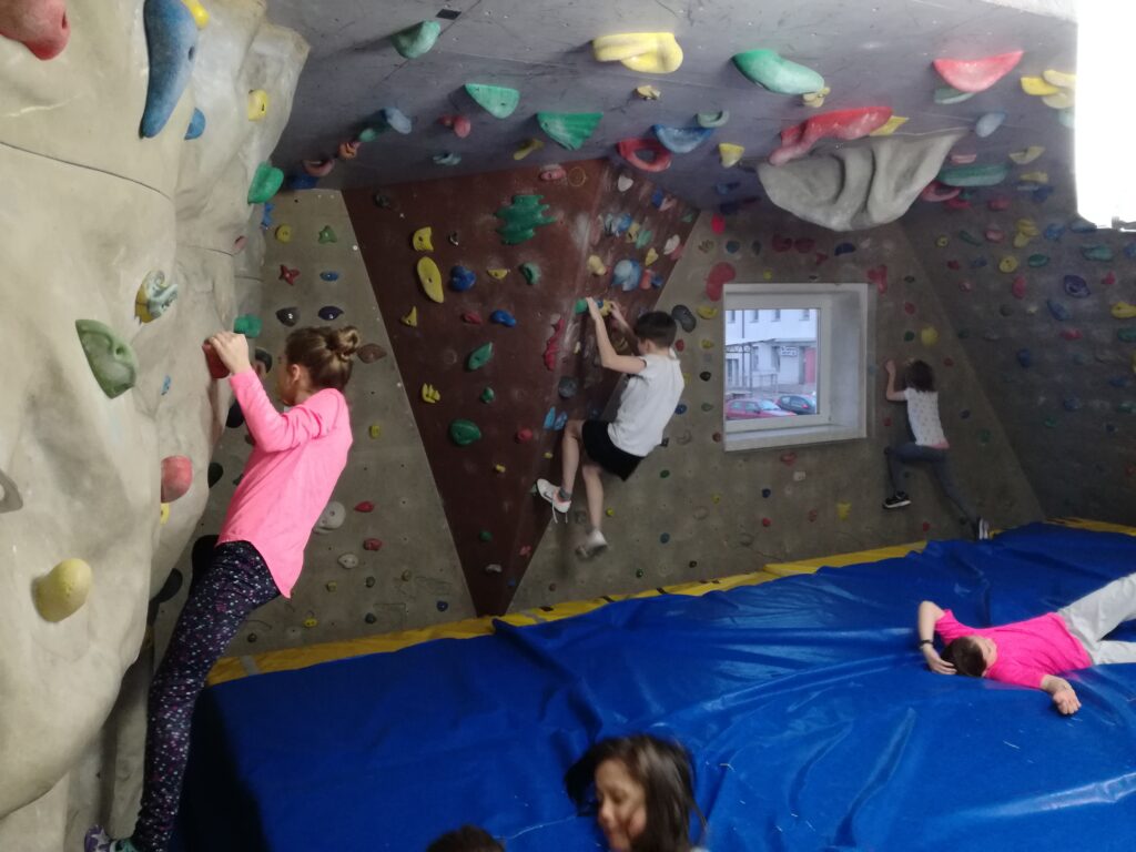 Učenci so zavzeto plezali, potne prste pa so mazali z magnezijem. Poskusili so plezati “z nogami” in skrbeli za to, da so imeli težišče čim bližje steni.