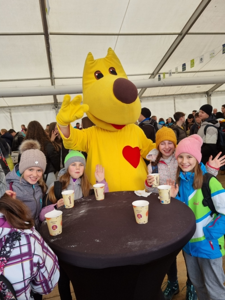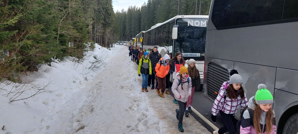 Avtobus nas je odpeljal na snežno Pokljuko, kjer je bila vrsta parkiranih avtobusov kar dolga, saj se je dogodka udeležilo okoli 3000 učencev iz cele Slovenije.
