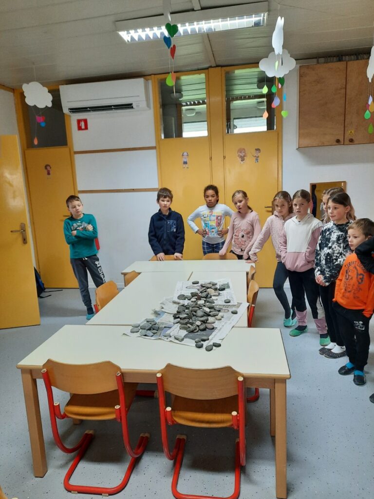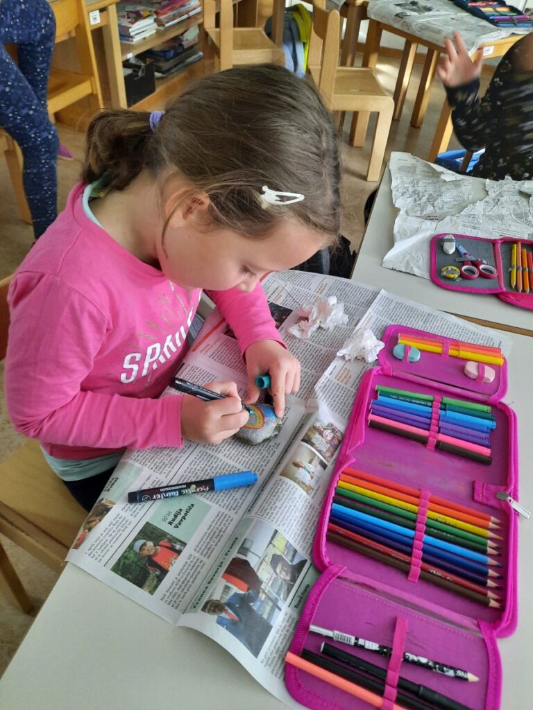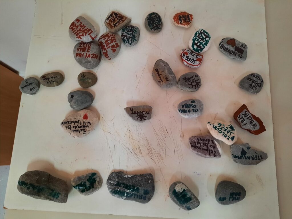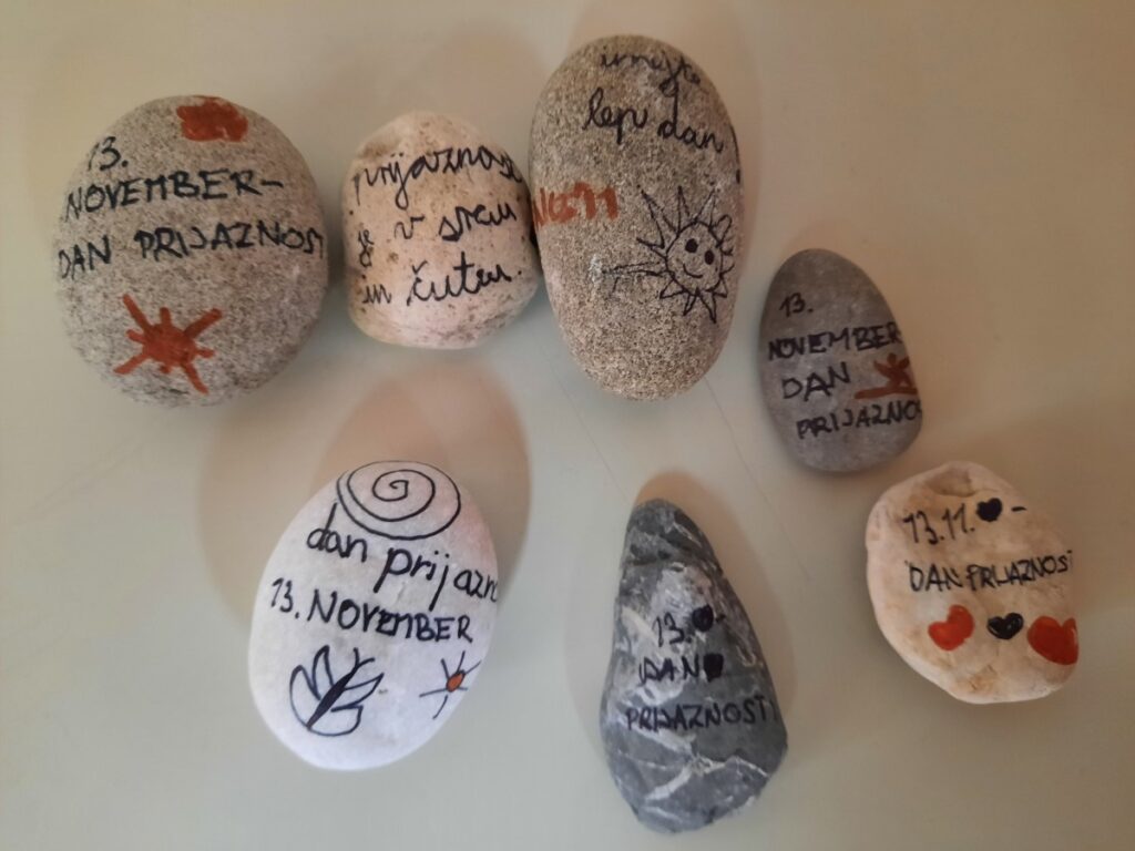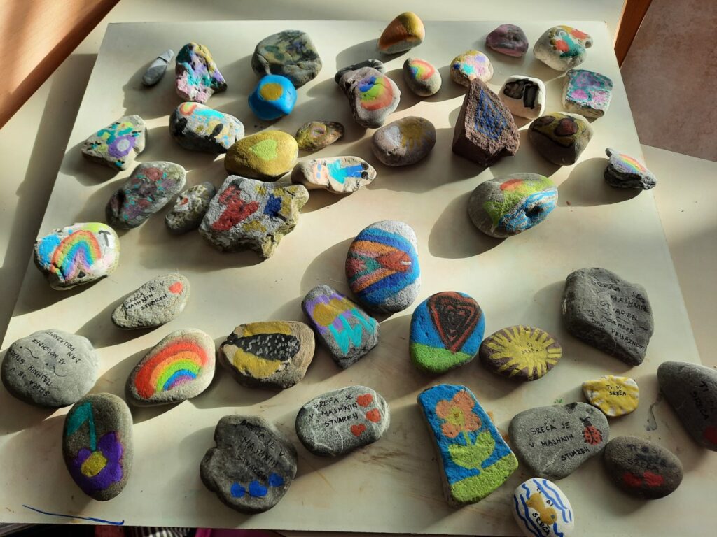 Ker pa naše vaščane ne vidimo vsak dan, da bi jim podarili nasmeh, smo se odločili, da jim na ta dan izkažemo pozornost in prijaznost na prav poseben način. Zjutraj smo odšli k reki Soči, nabrali kamenčke, pri pouku nanje narisali majhno risbico in napisali kratko misel. Nekaj kamenčkov smo na skrivaj, kot pozornost, postavili pred vrati nekaterih Kamnskih hiš že dopoldan, popoldan pa so to naredili učenci še na Volarjih, Seliščih in Kamnem. Verjamemo, da smo vsem polepšali danes dan in jim pričarali z našo prijaznostjo nasmeh na obrazu.