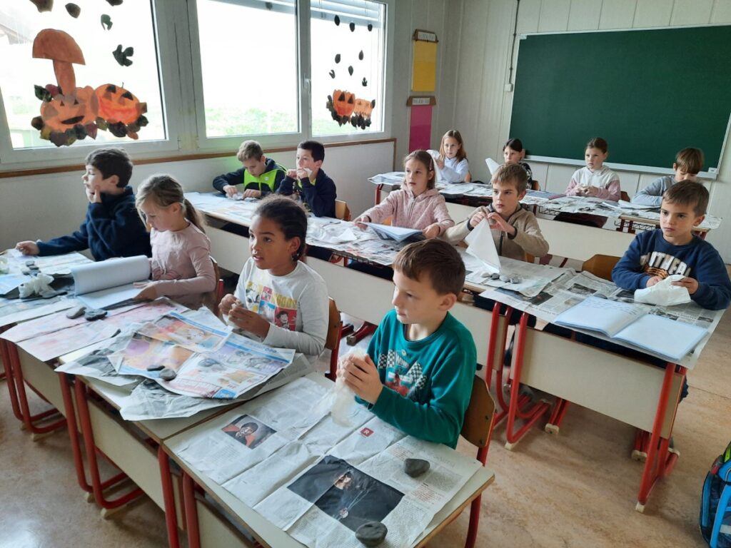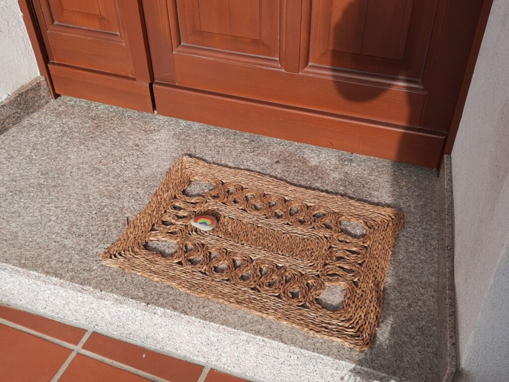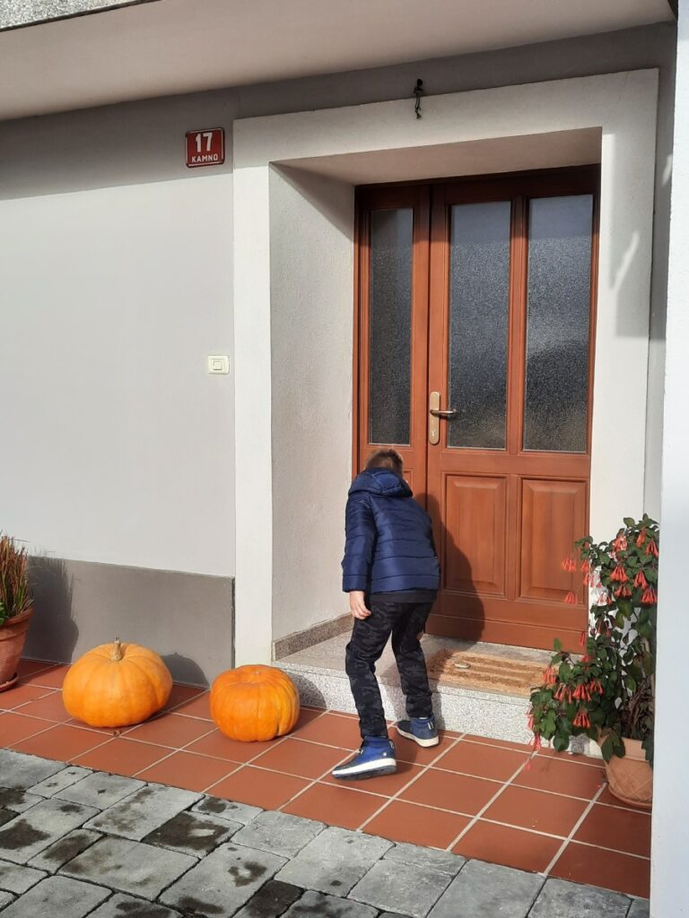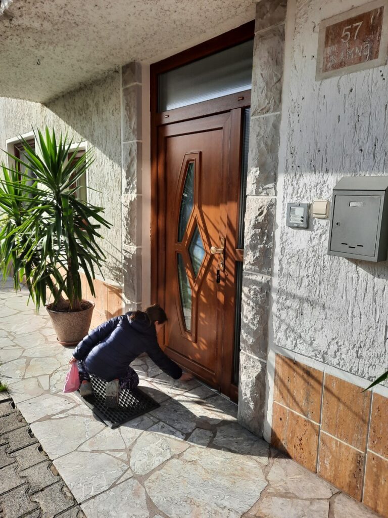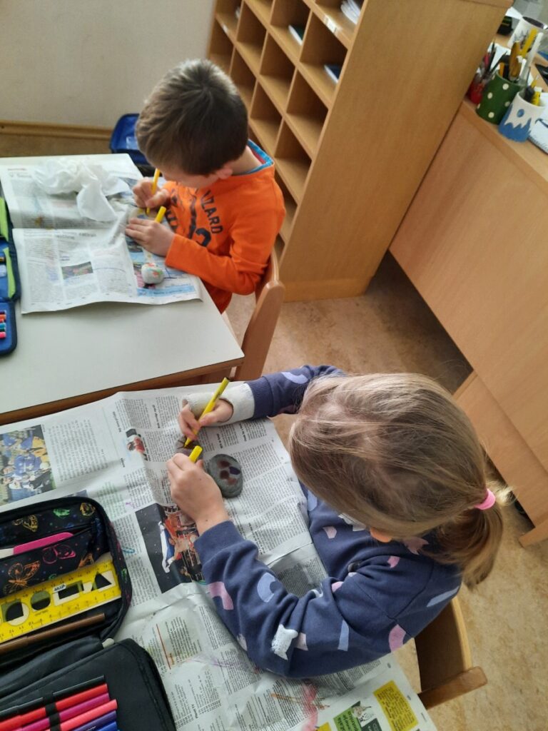 Ker pa naše vaščane ne vidimo vsak dan, da bi jim podarili nasmeh, smo se odločili, da jim na ta dan izkažemo pozornost in prijaznost na prav poseben način. Zjutraj smo odšli k reki Soči, nabrali kamenčke, pri pouku nanje narisali majhno risbico in napisali kratko misel. Nekaj kamenčkov smo na skrivaj, kot pozornost, postavili pred vrati nekaterih Kamnskih hiš že dopoldan, popoldan pa so to naredili učenci še na Volarjih, Seliščih in Kamnem. Verjamemo, da smo vsem polepšali danes dan in jim pričarali z našo prijaznostjo nasmeh na obrazu.