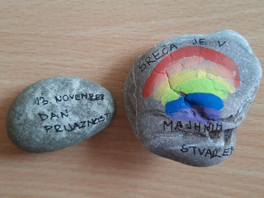 Letos smo se temu dnevu pridružili tudi vsi učenci na PŠ Kamno, saj si tudi mi želimo, da bi prijaznost preprosto postala del našega vsakdana, da bi lahko vsak dan v šoli sošolca pozdravili z nasmehom, mu kdaj le »dali petko« in mu tako pokazali, da nam je mar za njega ali pa ga le objeli, ko je padel na igrišču.