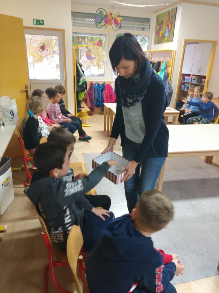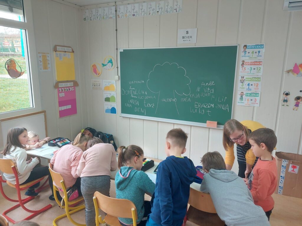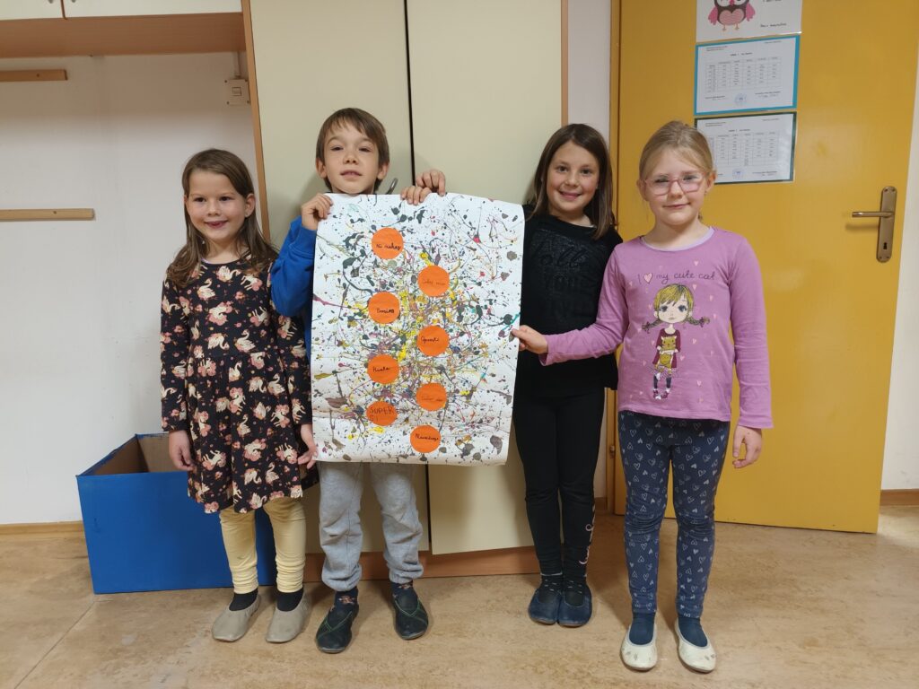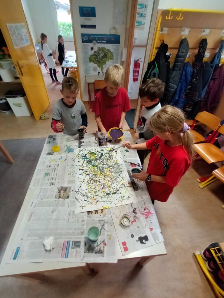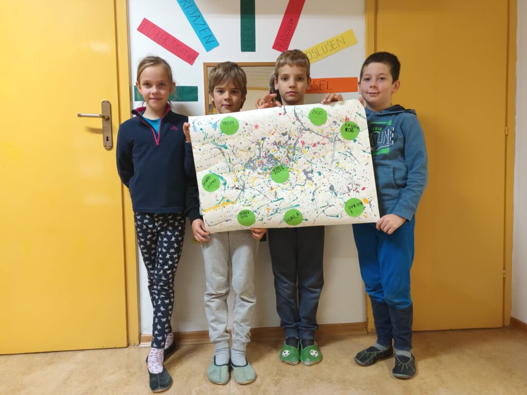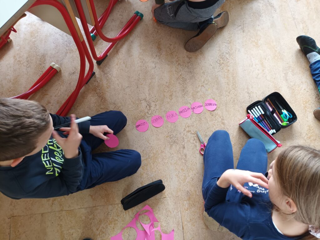 V skupinah smo naslikali abstraktno sliko, na listke napisali prijazne besede in jih zalepili na slike. Poslušali smo pravljico Kdo je napravil Vidku srajčico, v podaljšanem bivanju ogledali risanko Zootropolis in po poslušanju ter ogledu izvedli različne delavnice. K nam je prišla tudi Tina Koren, ki je z nami izvedla prijetno delavnico o strpnosti.