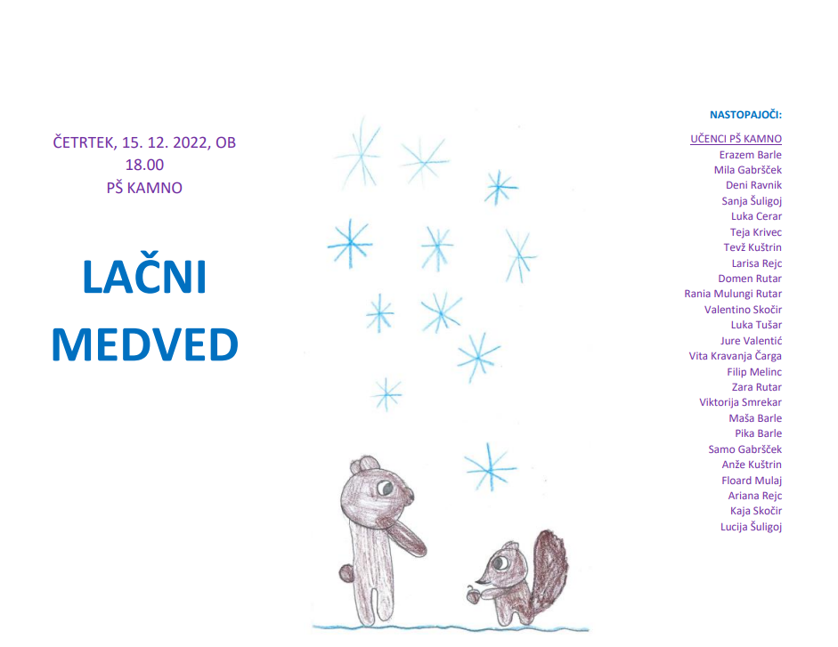 V četrtek, 15. decembra 2022, ob 18h vas učiteljice in otroci Podružnične šole Kamno vljudno vabijo na prireditev “Lačni medved”. Prisrčno vabljeni!