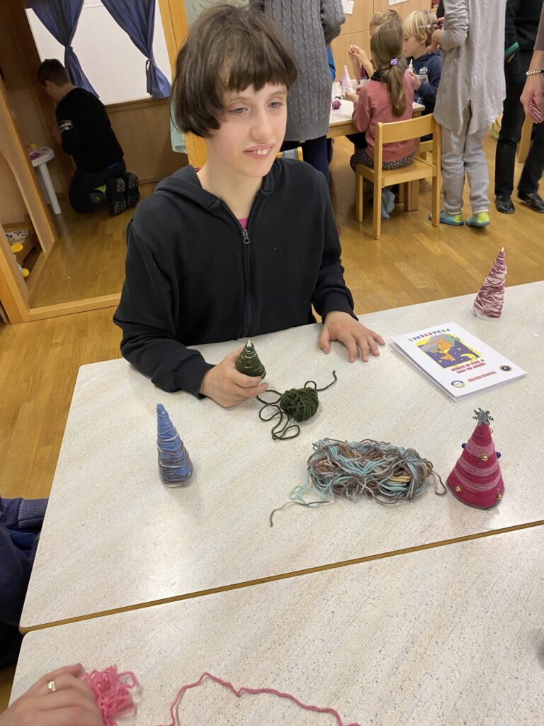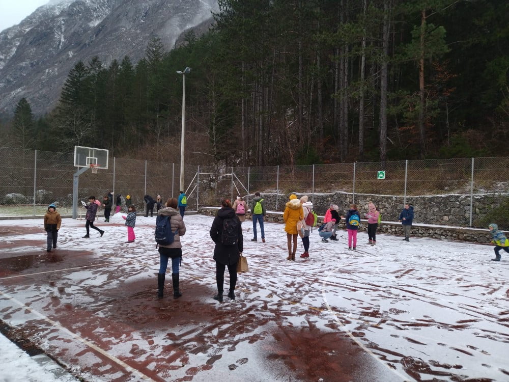 Dan se je začel zelo zimsko, saj je naletaval sneg in nas spremljal celotno vožnjo do Soče. Ob prihodu nam je tamkajšnja kuharica pripravila slastno malico ter posladek. Ko smo se najedli, smo si ogledali plesno točko, ki so nam jo pripravili učenci, potem pa smo skupaj izdelali novoletne smrečice iz volne. Ob tem smo zelo uživali in se ob praznični glasbi prav prijetno družili. Izmenjali smo si še darilca, ki smo jih pripravili drug drugemu. Za konec pa smo odšli na igrišče in se poigrali na letošnjem prvem snegu.