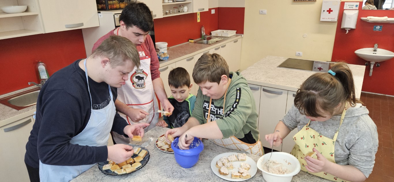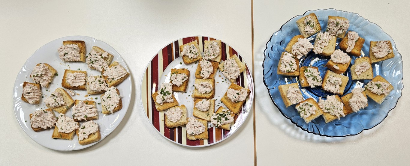 Jutro smo začeli v gospodinjski učilnici, kjer smo pripravili ribji namaz. Učenci so ribe pretlačili, dodali sirni namaz in začimbe ter vse skupaj dobro premešali. Namaz smo na koncu namazali na popečene kruhke in vse skupaj okrasili z drobnjakom. To je bil res odličen začetek dneva.