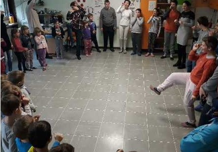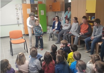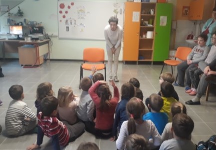 V času deževnega vremena nam je učiteljica Mojca Miklavič Ivančič popestrila dan s pripovedovanjem pravljice Lisica in volk, v kateri so sodelovali in se vanjo vživeli tudi otroci.