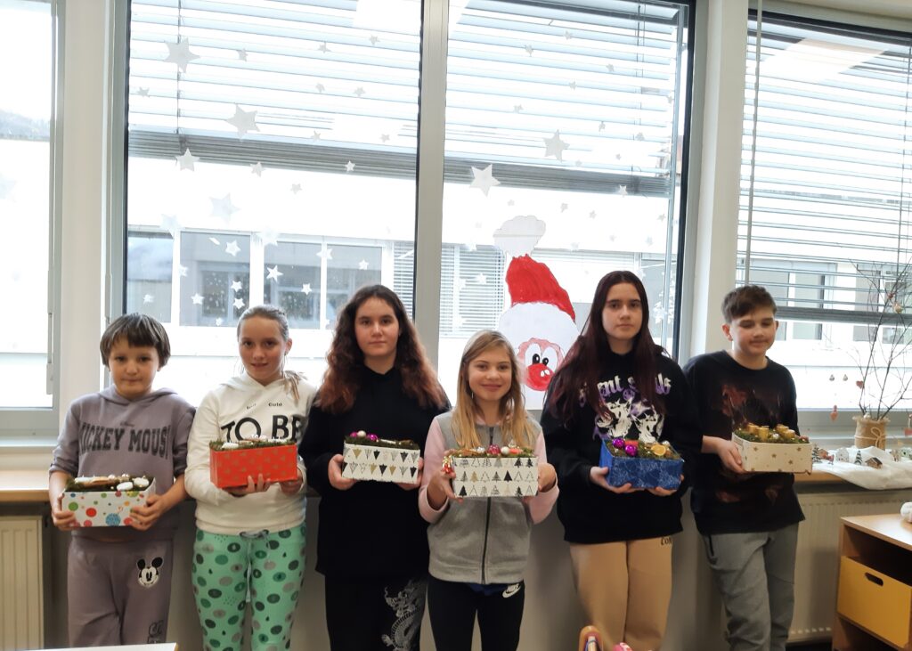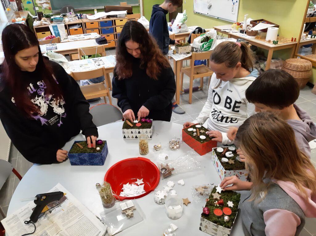 Učenci 2., 5. in 6. h razreda smo v petek pripravili novoletno delavnico. Najprej smo oblikovali praznično namizno dekoracijo. Kartonaste škatle smo zavili v darilni papir in jih napolnili z mahom. Ko je bila osnova pripravljena, pa je vsak učenec okrasil svojo škatlo. Nastale so zelo lepe dekoracije, ki prav gotovo krasijo domove učencev. Po malici pa smo okrasili učilnico in povabili teto Zimo naj nas že končno obišče in nasuje vsaj toliko snega, da se bomo lahko sankali. Izdelali smo tudi snežinke, s katerimi smo okrasili naše razredno drevesce. Mi smo pripravljeni, kaj pa vi?