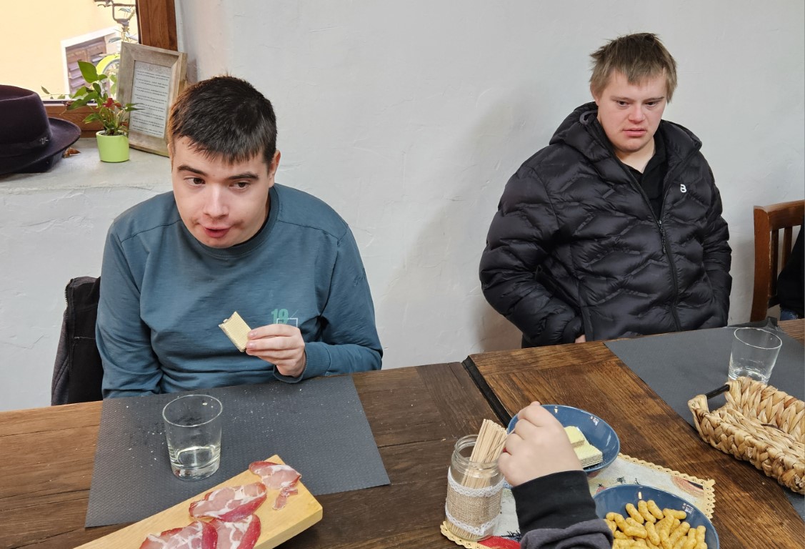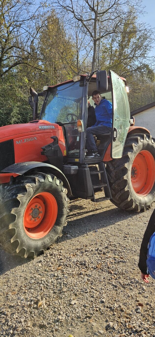 V sredo, 12. 11. 2024, so se učenci Posebnega programa VIZ odpravili v Seniški Breg, natančneje na kmetijo Pr’ Lukčevih, katere gospodarji so starši našega učenca Roka. Že na poti iz Avč proti Seniškemu Bregu smo opazili, da našemu mini busu sledi velik traktor. Na njem smo zagledali nasmejanega Roka in njegovega očeta. Kmalu nas je ob poti ustavila še mama Ivana. Na prvi postojanki smo si ogledali rejo prašičev. Izvedeli smo, da imajo Lukčevi trenutno okoli 80 prašičev, za katere z ljubeznijo skrbi Rokova mama. Fante je zanimal tudi traktor, na katerega so se lahko po želji usedli.