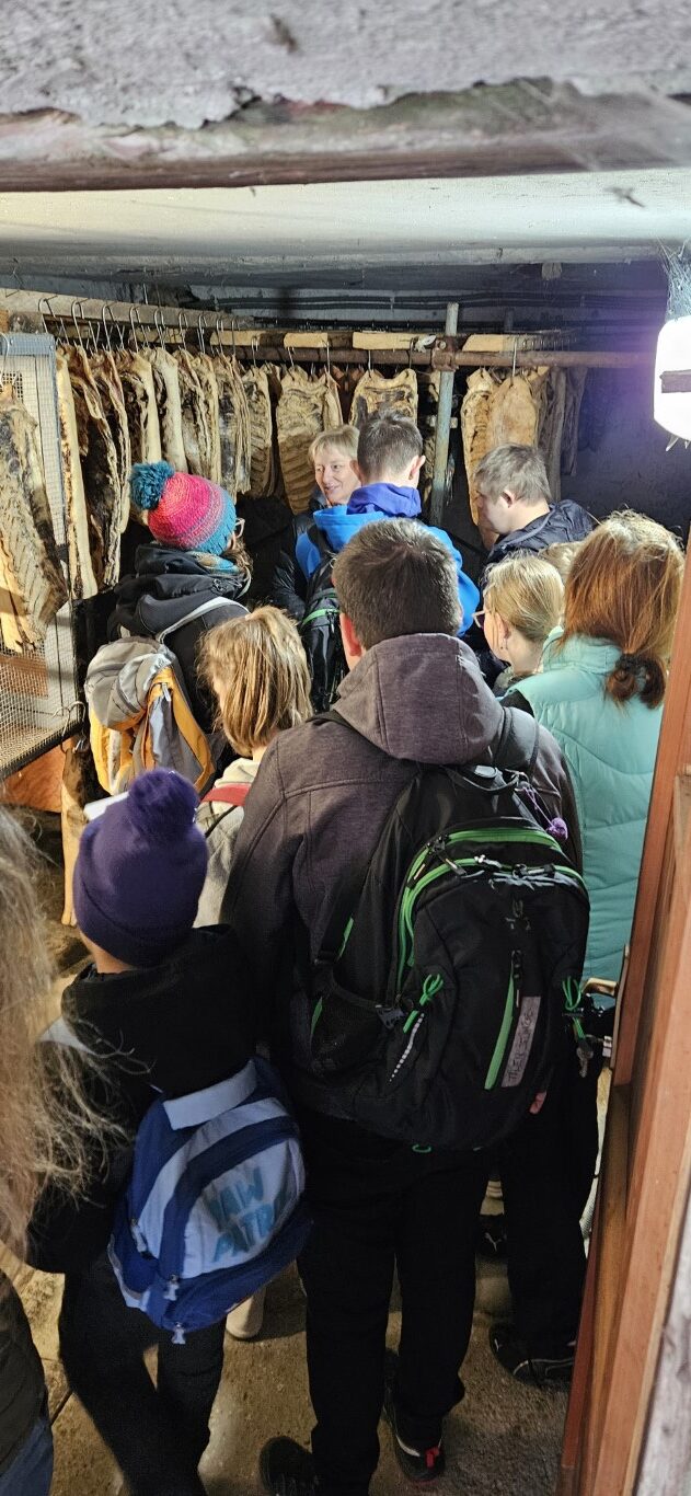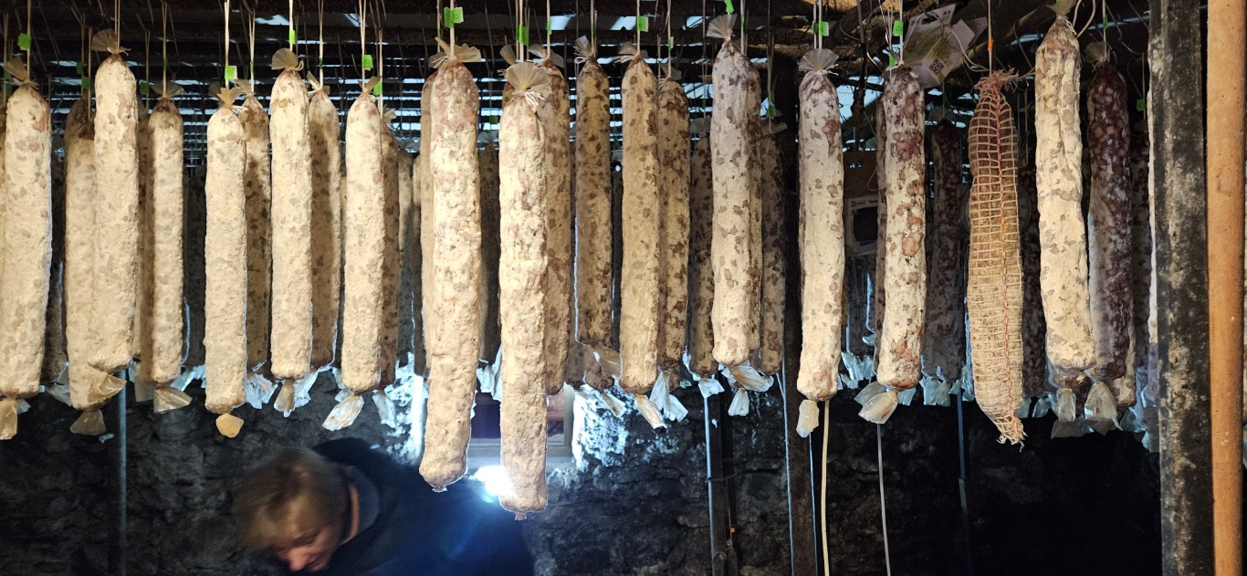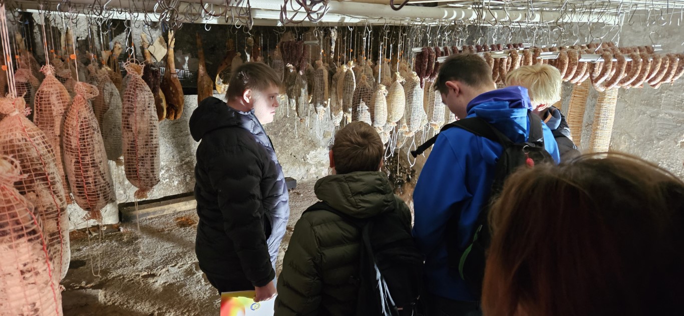 Nato smo pot nadaljevali do njihove kmetije. Tam smo si ogledali postopek izdelave njihovih mesnin. Navdušeni smo bili nad starimi kletmi, v katerih so s stropa, kot kapniki, visele pancete, klobase, salame in pršuti.