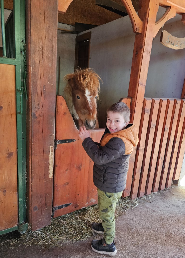 Kasneje so nam prijazni gostitelji razkazali še svoje živali. Ogledali smo si pujske, krave, petelina, kokoši in konje ter izvedeli nekaj zanimivosti o njihovem življenju na kmetiji.