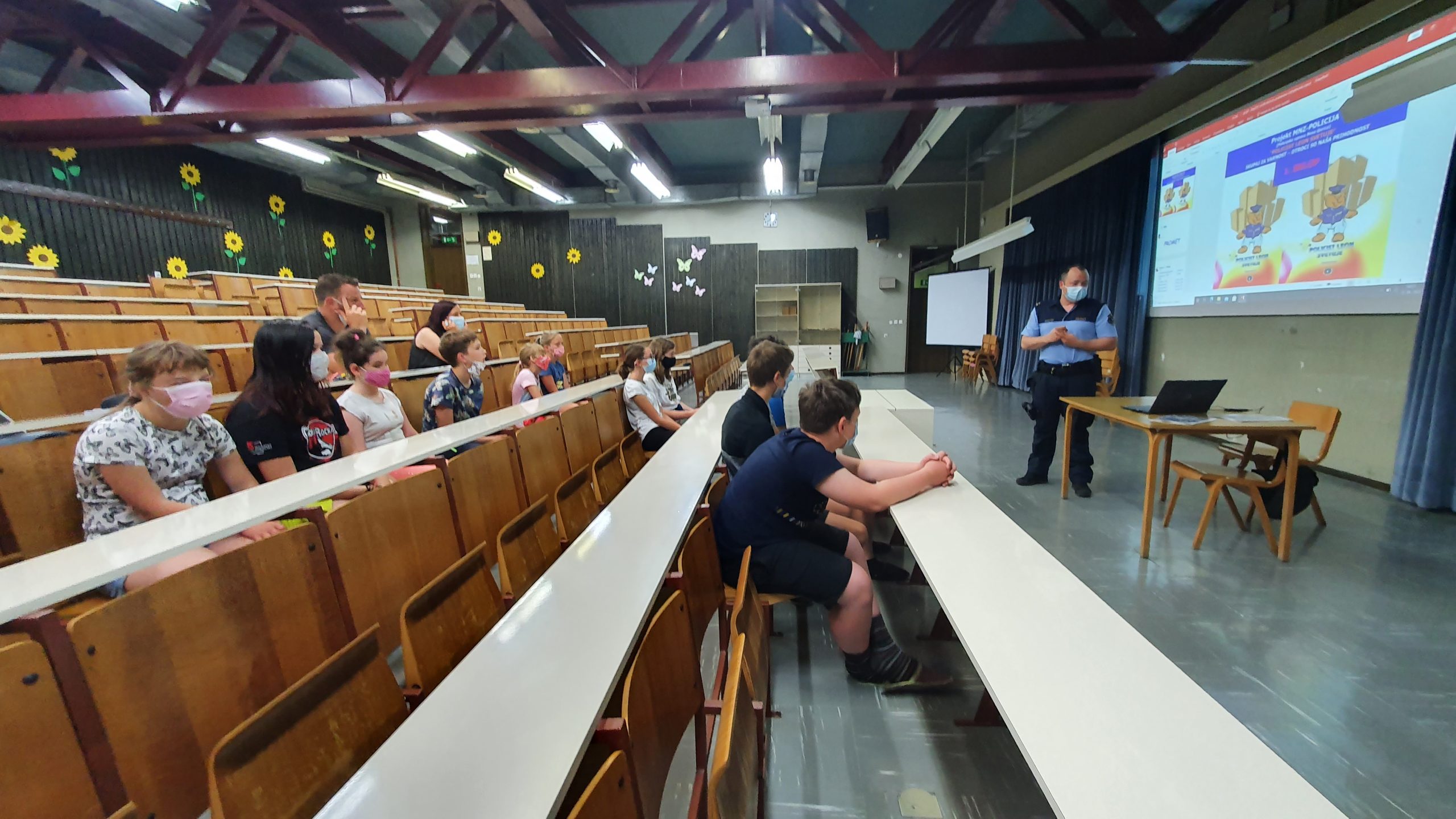 V torek, 22.6.2021, nas je v okviru projekta Policist Leon svetuje obiskal policist Peter Čeplak s policijske postaje Tolmin. Poučil nas je o medvrstniškem nasilju. Izpostavil je, da se različne oblike nasilja dogajajo tako v šoli, kot tudi na poti v šolo, na športnem igrišču ali na internetu. Naša odgovornost je, da na nasilje opozorimo odrasle in da ne spodbujamo tistih, ki se grdo vedejo do drugih. Prav tako smo izvedeli nekaj o delu policistov, kaznivih dejanjih ter kako poskrbimo za varnost pri kopanju ter za varnost svoje lastnine.