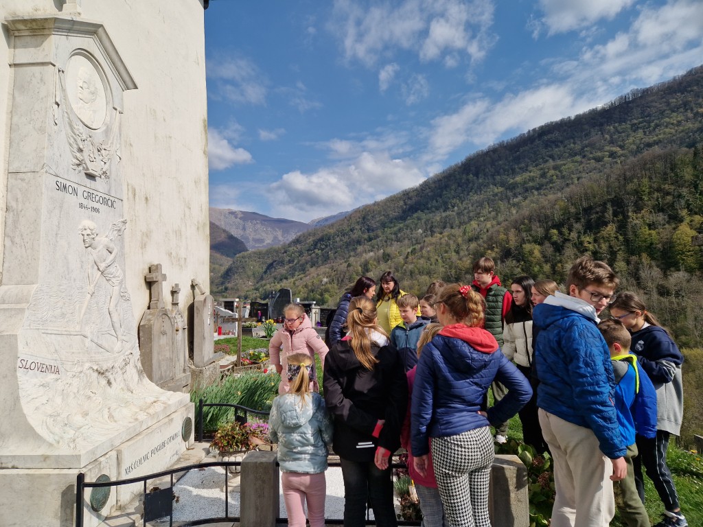 Danes smo imeli kulturni dan. Obiskali smo Gregorčičevo rojstno hišo na Vrsnem. Tja smo se zapeljali z avtobusom. Ko smo pomalicali je prišla gospa, ki nas je popeljala po muzeju. Najprej nam je opisala pesnikovo življenje, ki ga je preživel kot pastirček v rojstni vasi, nas popeljala skozi njegova šolska leta in čas, ko je bil duhovnik, vse do njegove smrti. Potem smo vstopili v Gregorčičevo hišo. Njegovo rojstno hišo so spremenili v muzej. V njem smo si ogledali različne predmete, ki so nas popeljali v obdobje njegovega življenja. V zgornjem nadstropju pa smo videli tudi odlitek njegovega obraza po smrti, njegovo pisalno mizo, pa tudi različne izdaje njegovih pesmi. Zahvalili smo se in se odpeljali v dolino. Le nekaj minut iz majhne vasice Smast se vzpenja griček s cerkvijo Svetega Lovrenca. Tam smo si ogledali pesnikov grob in mu zapeli pesem Veseli pastir ter uživali v razgledu na dolino Soče. Po krajšem sprehodu smo se odpeljali do Kobarida in ugotovili, da šola nosi ime Simona Gregorčiča. Sprehodili smo se po Gregorčičevi ulici in prišli do trga, kjer smo takoj opazili mogočen pesnikov kip, mu prižgali svečko in tako zaključili dan.
